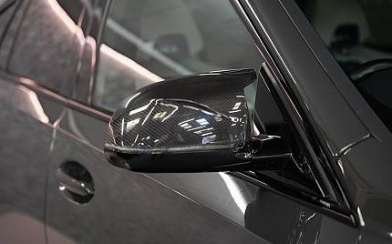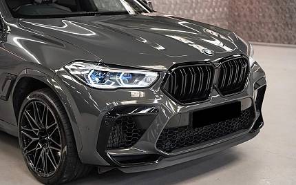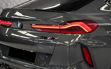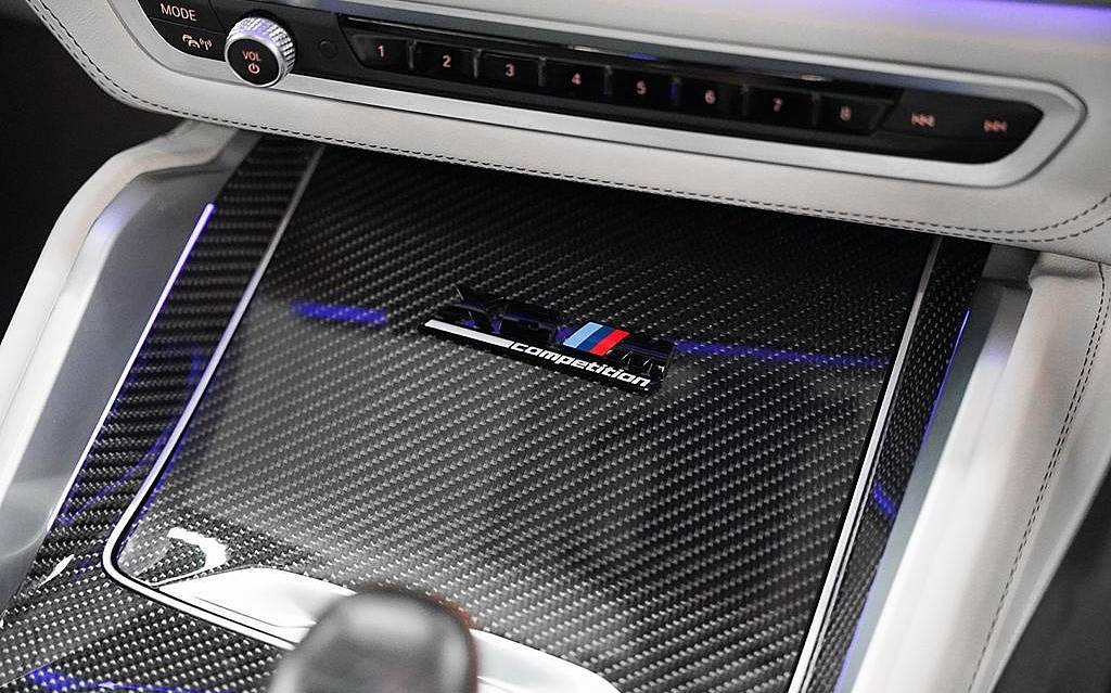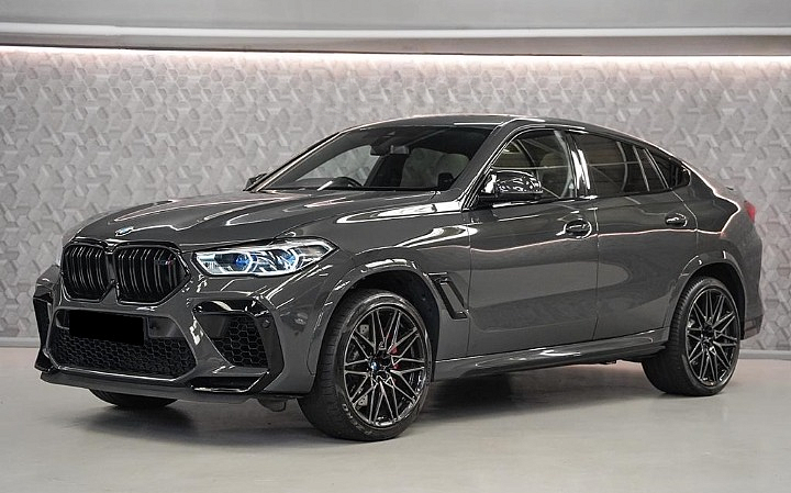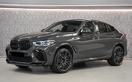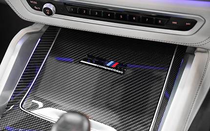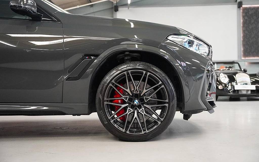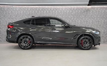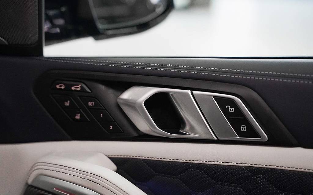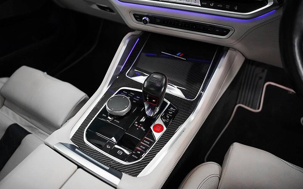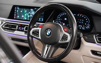 BMW X6 M Competition 4.4 Panorama Glass Roof Sky Lounge на 21 и 22 дюймовых легкосплавных дисках — M Light 818 Bi-Colour, аудиосистема Harman Kardon Surround Audio, полная отделка кожей Merino цвета слоновой кости в комбинации с цветом Night Blue, пакет Comfort Plus, обивка потолка — алькантара BMW Individual, отделка салона карбоновым волокном, боковые зеркала M Carbon, подогрев и вентиляция сидений, подогрев и охлаждение подстаканников, фоновая подсветка, проекционный дисплей.