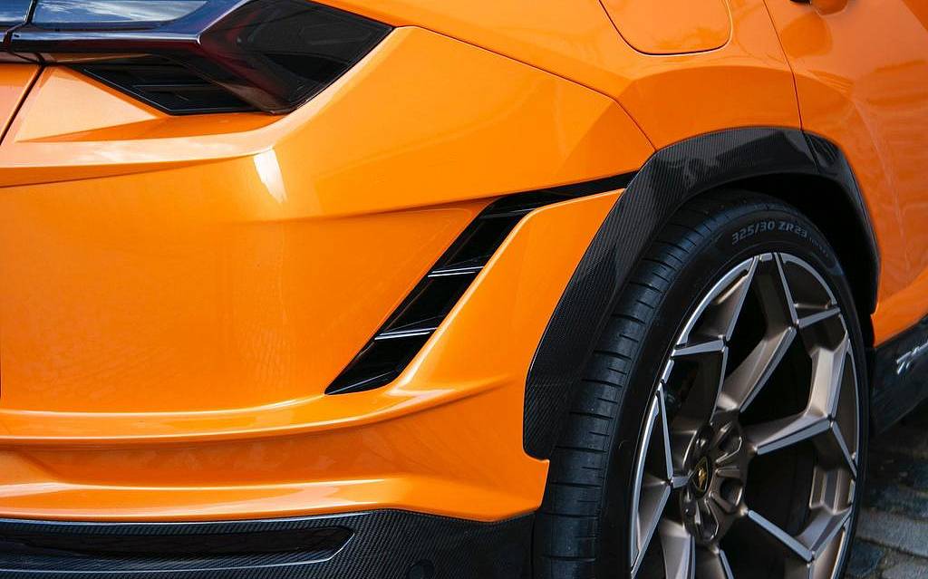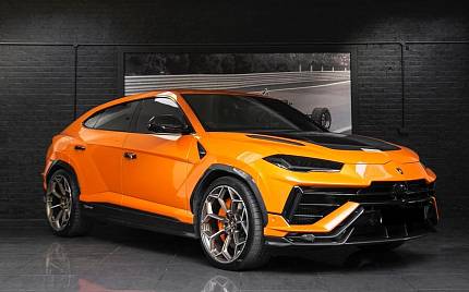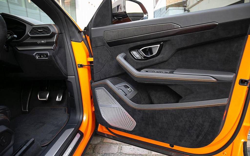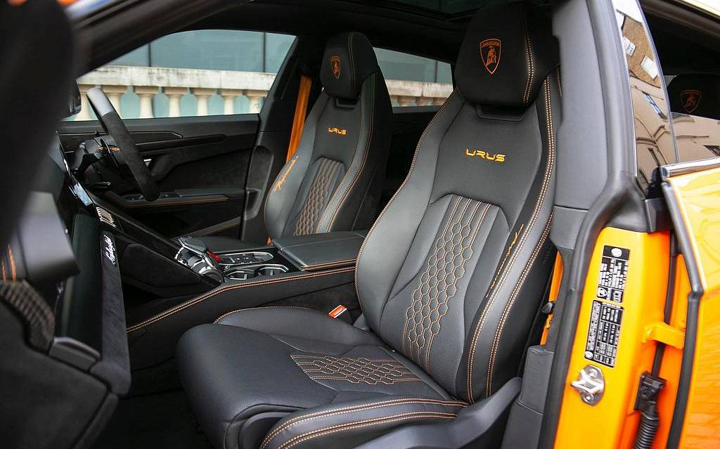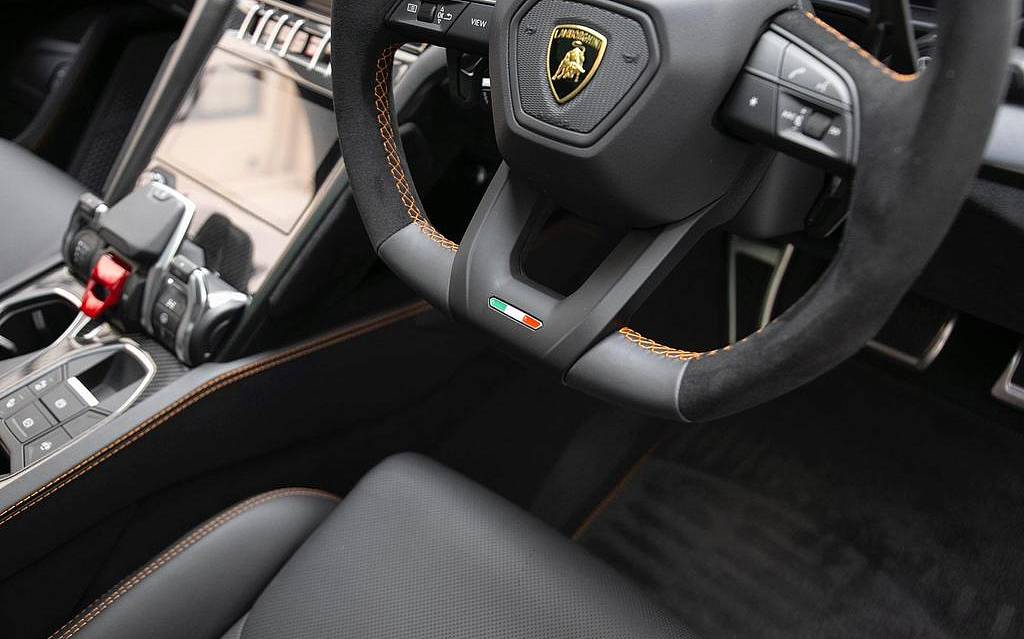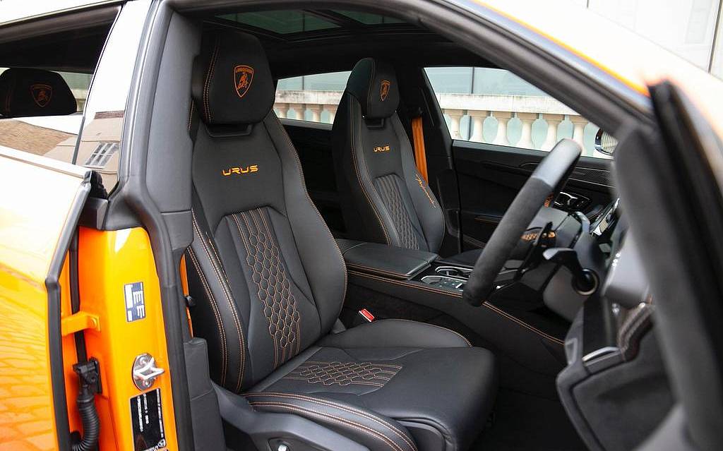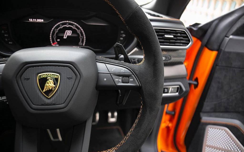 Lamborghini Urus Performante Panoramic Sunroof V8 4.0 на 23 дюймовых дисках Pelope Diamond Finished Bronze, Arancio Borealis, полный пакет внешней отделки из углеродного волокна, капот из видимого блестящего углеродного волокна, титановые колесные болты, оранжевые суппорты, задний спойлер из углеродного волокна, выхлопные трубы из титана, тонированные стекла (со звуко- и теплоизоляцией), одноцветная кожа Nero Cosmus с отделкой Performante, ремни безопасности Arancio Leonis, панорамная крыша, полный пакет ADAS с проекционным дисплеем, полностью электрические передние сиденья с вентиляцией и массажем, подогрев задних сидений, подогрев рулевого колеса, усовершенствованная 3D-аудиосистема Bang & Olufsen, коврики с кожаной окантовкой и двойной строчкой, ковровое покрытие Nero Ade, система премиум-качества воздуха, радио DAB.
