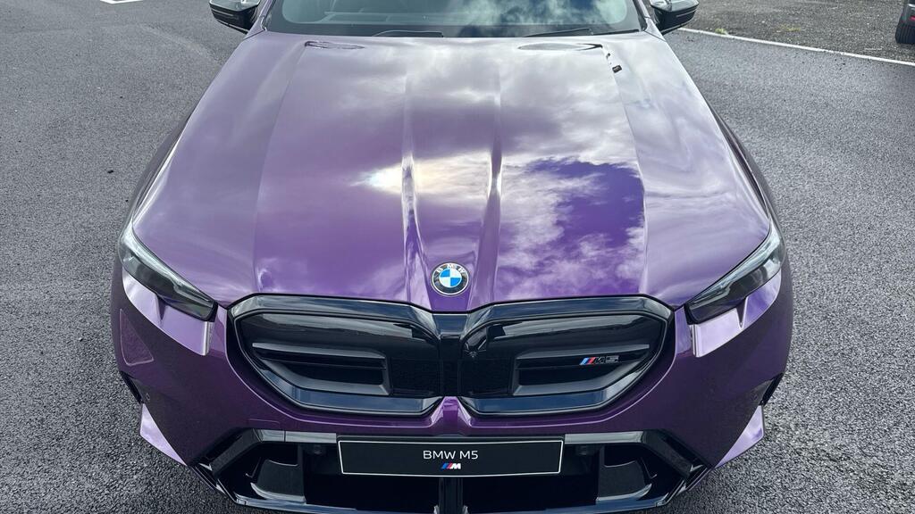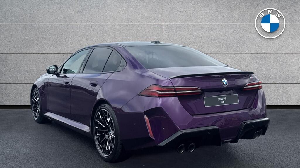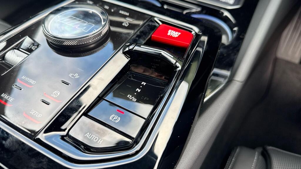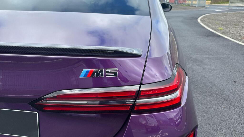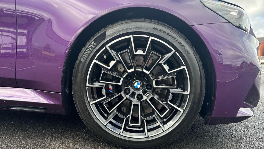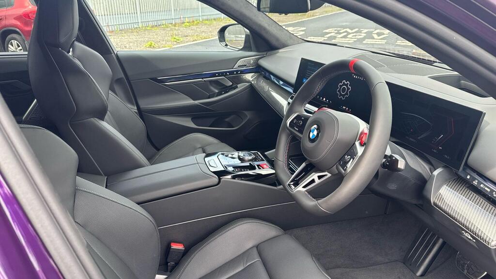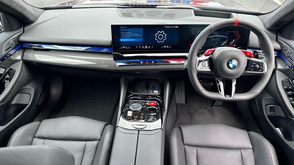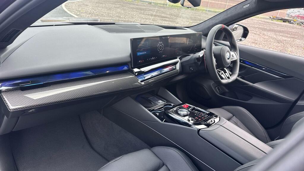 BMW M5 4.4 22.1kWh Steptronic xDrive Panoramic Roof на легкосплавных дисках 20–21 дюйм — M Light 952 M двухцветного черного цвета с разноразмерными шинами, пакет «Комфорт», система помощи водителю Professional, обивка потолка — антрацитовая алькантара, система Active Guard, звукоизоляция для пешеходов, лоток для беспроводной зарядки, солнцезащитное стекло, подогрев передних сидений, система помощи при парковке Plus, спортивный дифференциал M, камера внутреннего обзора.