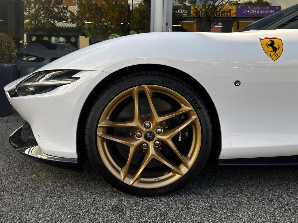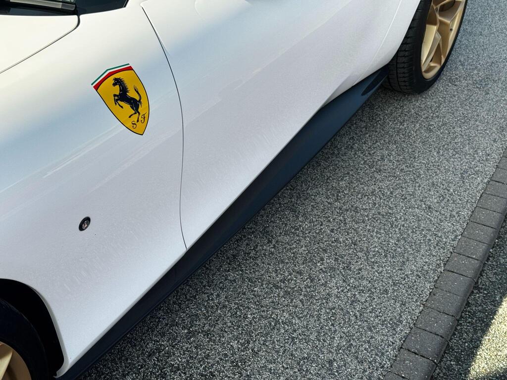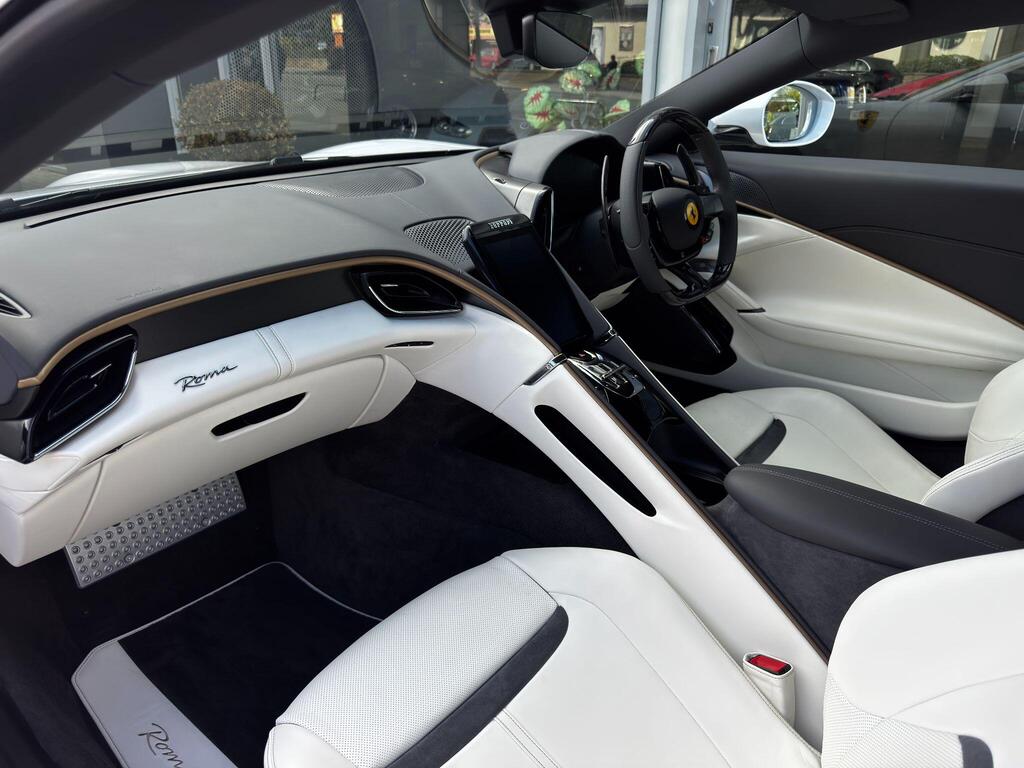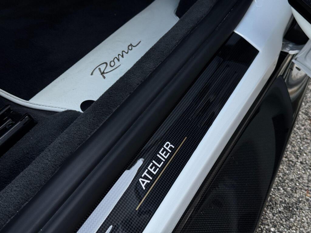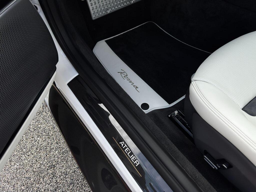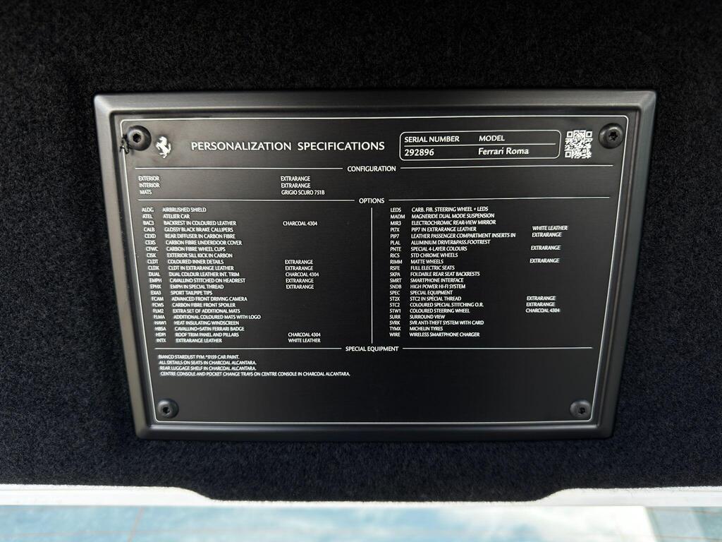 Ferrari Roma 3.8 V8 F1 DCT на 20-дюймовых легкосплавных дисках, карбон-керамическая тормозная система CCM3, электропривод передних сидений с функцией памяти настроек водителя, подогрев передних сидений, система контроля тяги F1-Trac, Apple CarPlay, камера заднего вида, электропривод рулевой колонки, цифровой дисплей зоны водителя, подрулевые переключатели из углеродного волокна, электроскладывающиеся боковые зеркала, Bluetooth, спутниковая навигация, радио DAB, двухзонный климат-контроль. Специальные пожелания (перламутровая краска Bianco Stardust, аэрографические щитки Scuderia, кожаный салон Bianco/Charco, окрашенные диски Satin Gold, эмблемы Ferrari Satin, персонализированные карбоновые накладки на пороги Atelier, золотая строчка, специальная), задний диффузор из углеродного волокна, накладка на днище дверей из углеродного волокна, двухцветный кожаный салон, мощная аудиосистема JBL Hi-Fi, камера кругового обзора, рулевое колесо по запросу (угольное), спортивные выхлопные трубы, передний спойлер из углеродного волокна, система Magneride Dual Mode Подвеска, рулевое колесо из углеродного волокна со светодиодами, черные тормозные суппорты, вставки из угольно-кожи в салоне, накладки на пороги из углеродного волокна, кожаные спинки сидений, складные спинки задних сидений, электрохромное зеркало заднего вида, коврики с вышитым логотипом, вышитая золотая гарцующая лошадь на подголовнике, теплоизоляционное лобовое стекло, алюминиевая подставка для ног, колпаки колес из углеродного волокна.