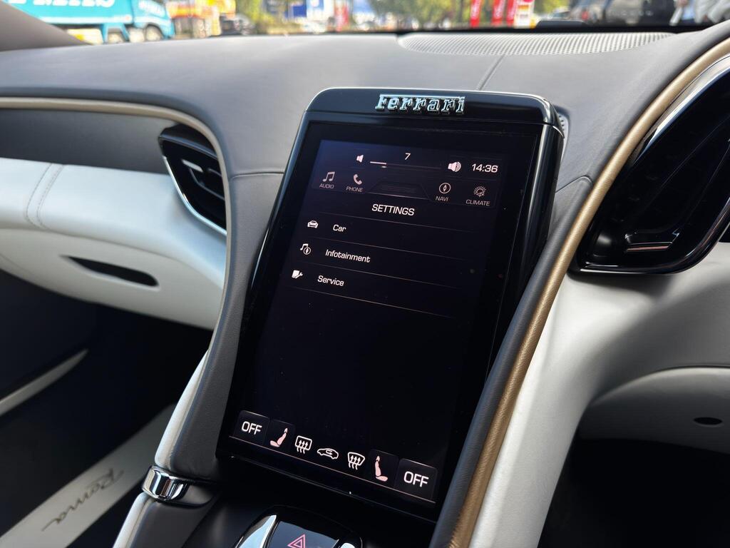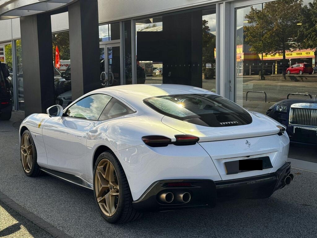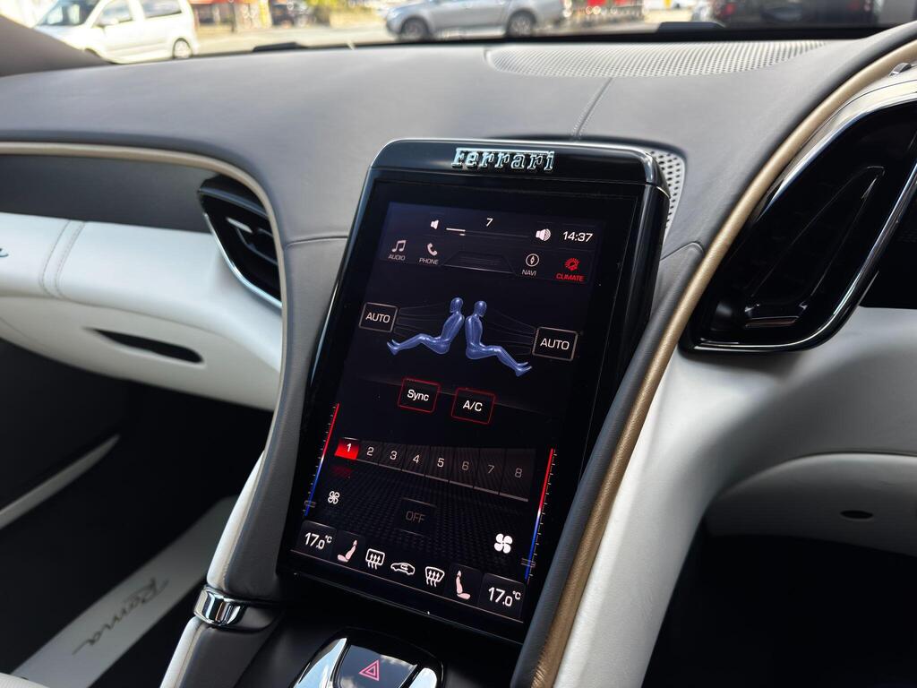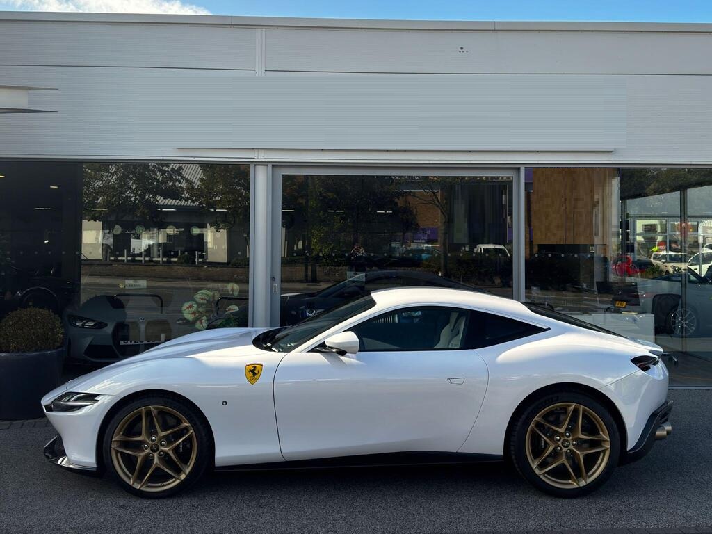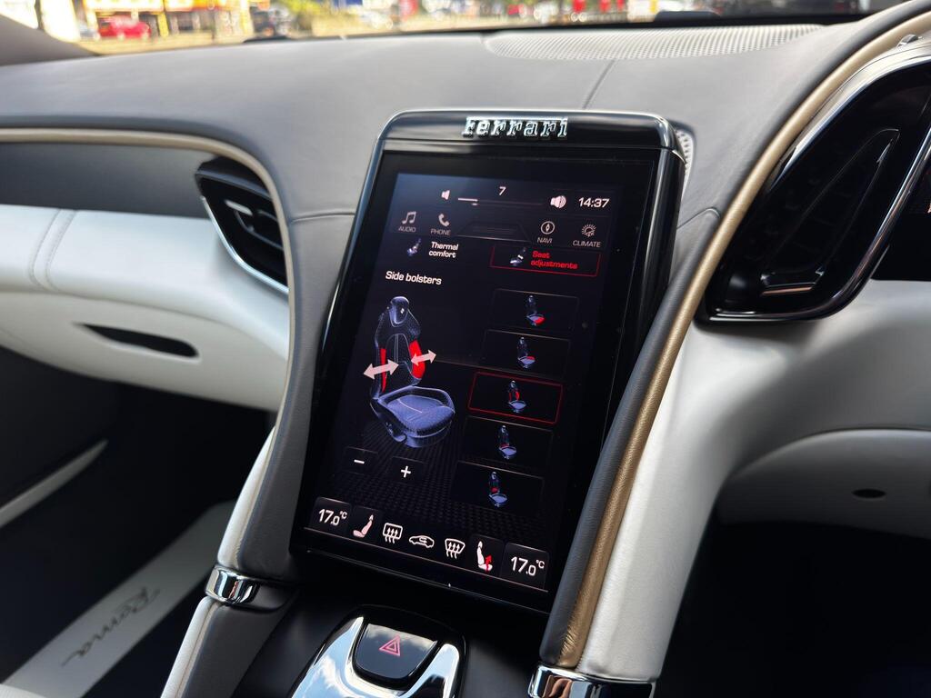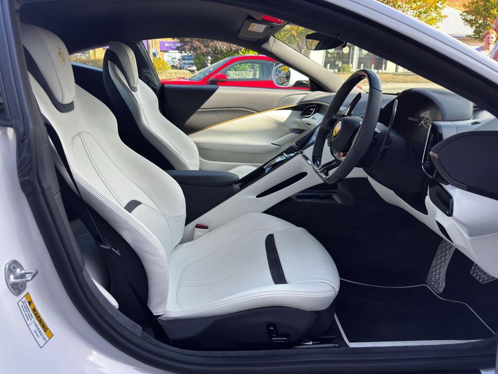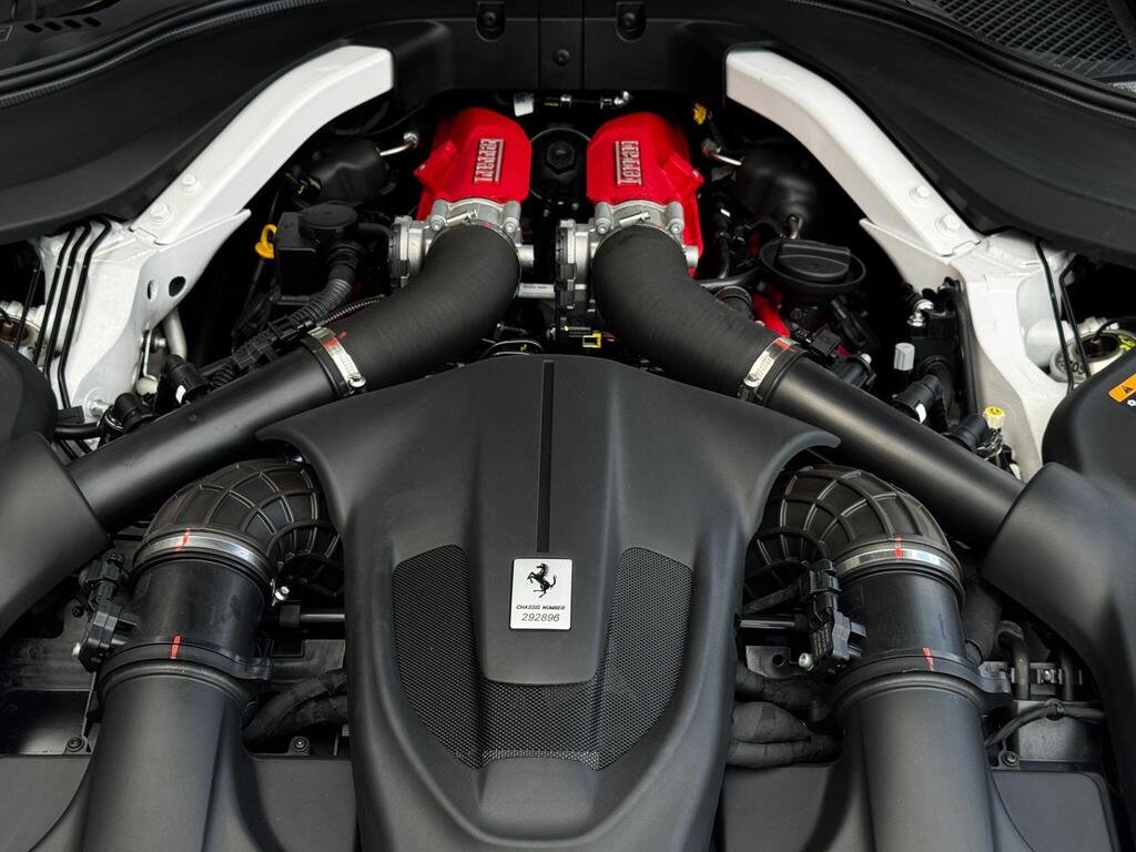 Ferrari Roma 3.8 V8 F1 DCT на 20-дюймовых легкосплавных дисках, карбон-керамическая тормозная система CCM3, электропривод передних сидений с функцией памяти настроек водителя, подогрев передних сидений, система контроля тяги F1-Trac, Apple CarPlay, камера заднего вида, электропривод рулевой колонки, цифровой дисплей зоны водителя, подрулевые переключатели из углеродного волокна, электроскладывающиеся боковые зеркала, Bluetooth, спутниковая навигация, радио DAB, двухзонный климат-контроль. Специальные пожелания (перламутровая краска Bianco Stardust, аэрографические щитки Scuderia, кожаный салон Bianco/Charco, окрашенные диски Satin Gold, эмблемы Ferrari Satin, персонализированные карбоновые накладки на пороги Atelier, золотая строчка, специальная), задний диффузор из углеродного волокна, накладка на днище дверей из углеродного волокна, двухцветный кожаный салон, мощная аудиосистема JBL Hi-Fi, камера кругового обзора, рулевое колесо по запросу (угольное), спортивные выхлопные трубы, передний спойлер из углеродного волокна, система Magneride Dual Mode Подвеска, рулевое колесо из углеродного волокна со светодиодами, черные тормозные суппорты, вставки из угольно-кожи в салоне, накладки на пороги из углеродного волокна, кожаные спинки сидений, складные спинки задних сидений, электрохромное зеркало заднего вида, коврики с вышитым логотипом, вышитая золотая гарцующая лошадь на подголовнике, теплоизоляционное лобовое стекло, алюминиевая подставка для ног, колпаки колес из углеродного волокна.