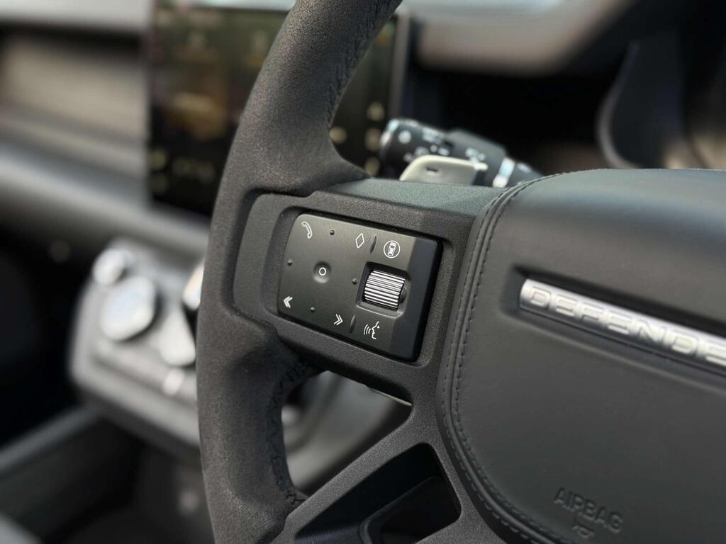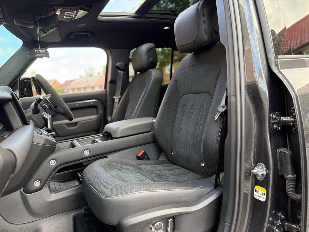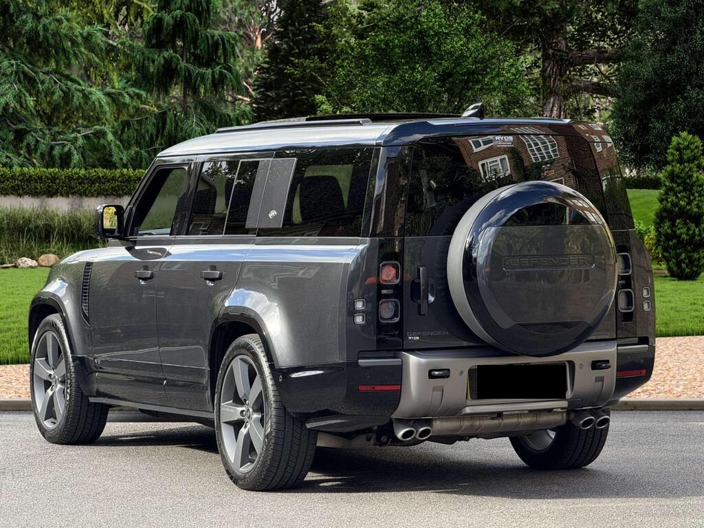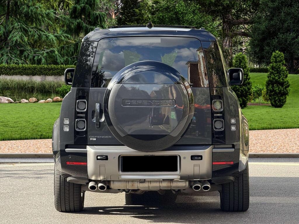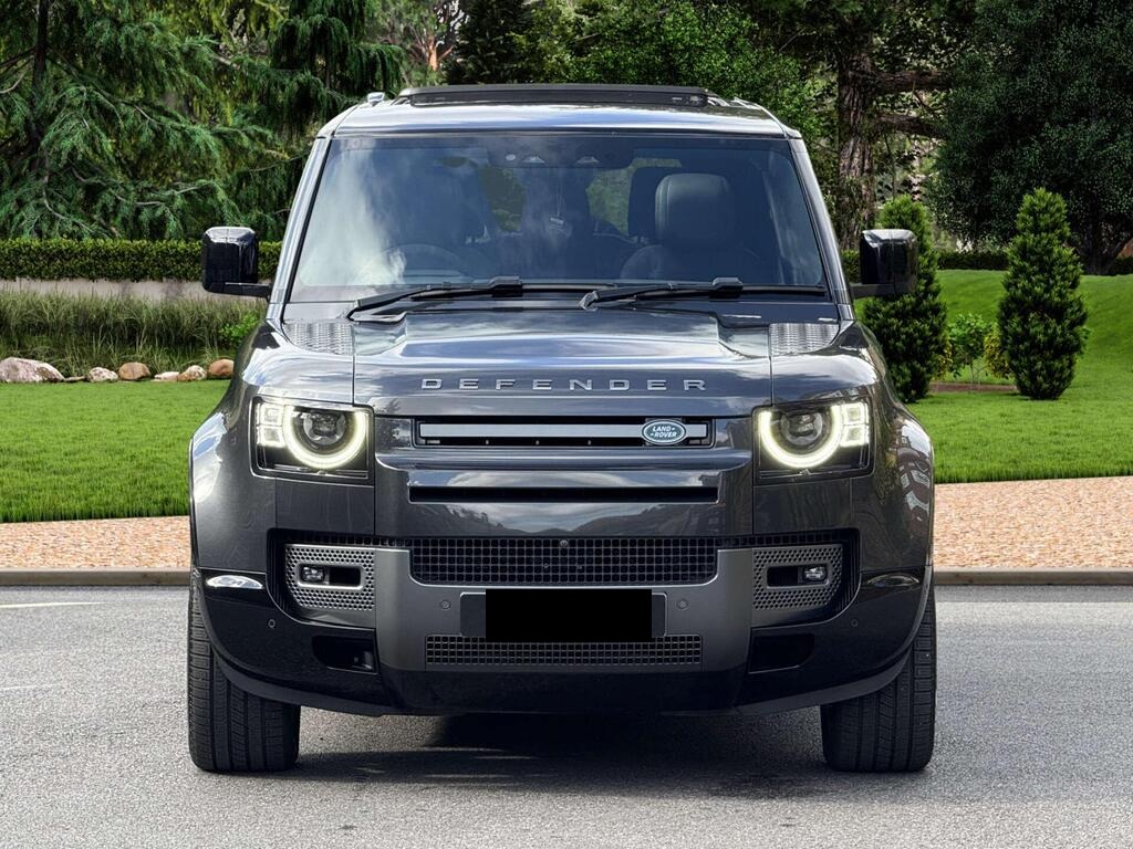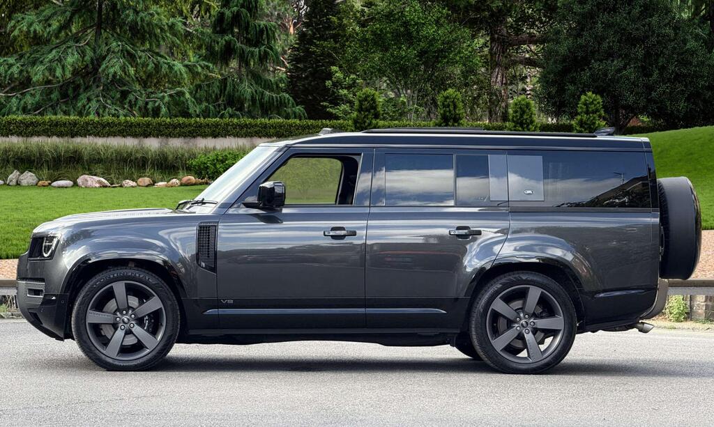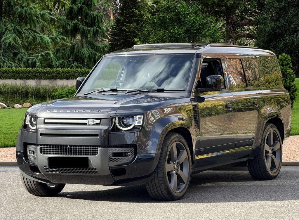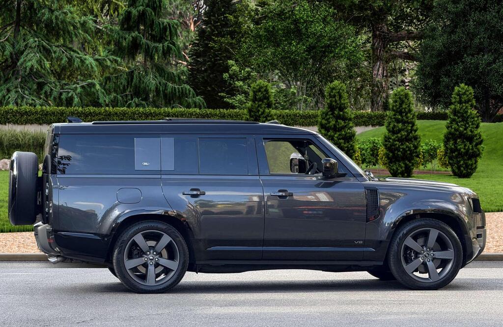 Land Rover Defender 130 5.0 P500 V8 4WD Panoramic Sunroof на 22-дюймовых легкосплавных дисках Style 5098 — 5 спиц — темно-серый сатиновый, 14-позиционные передние сиденья с электроприводом, подогревом и вентиляцией, памятью настроек и 4-позиционными подголовниками с механической регулировкой, подогрев рулевого колеса, холодильник в передней центральной консоли, четырехзонный климат-контроль, система помощи при парковке на 360 градусов, 3D-камера кругового обзора, адаптивный круиз-контроль ACC, система помощи при слепых зонах, проекционный дисплей, распознавание дорожных знаков и адаптивный ограничитель скорости, Apple CarPlay, аудиосистема Meridian, беспроводная зарядка устройств, 11,4-дюймовый сенсорный экран.