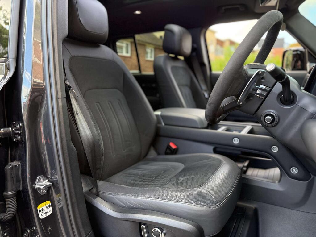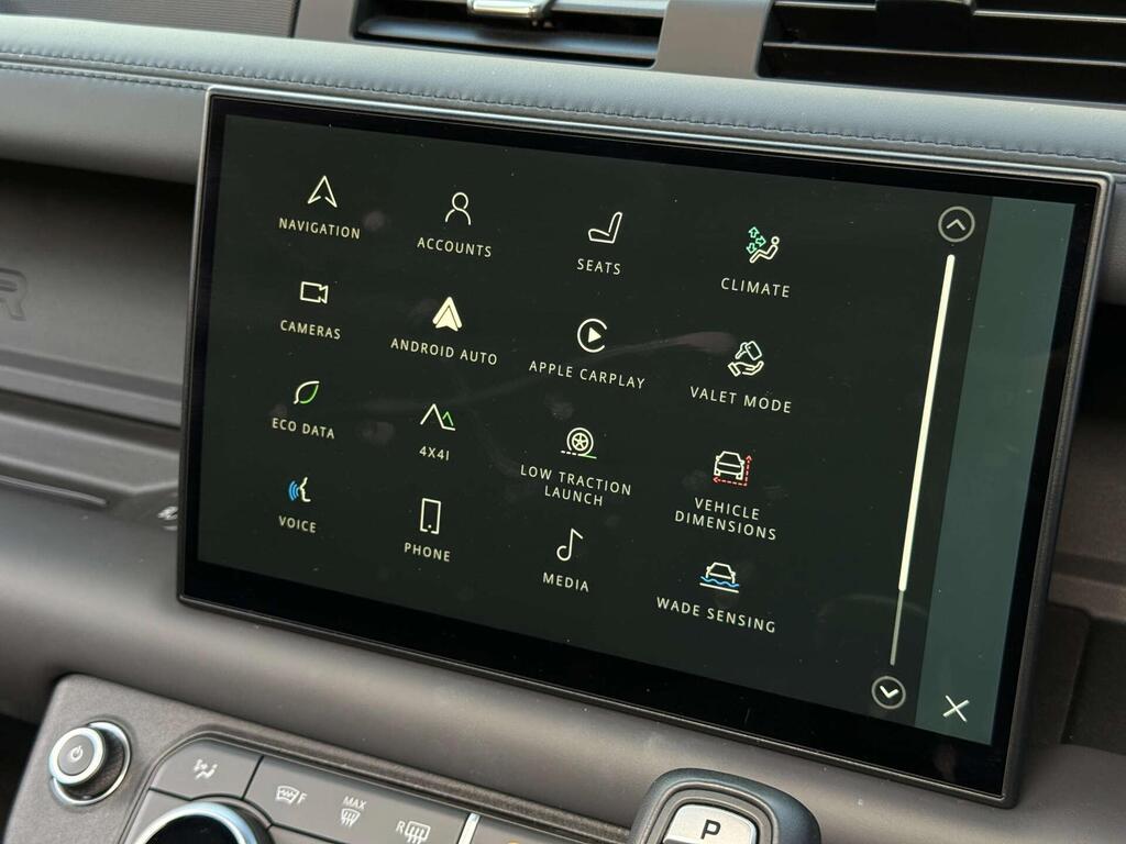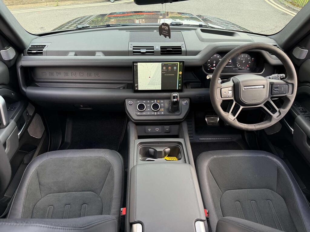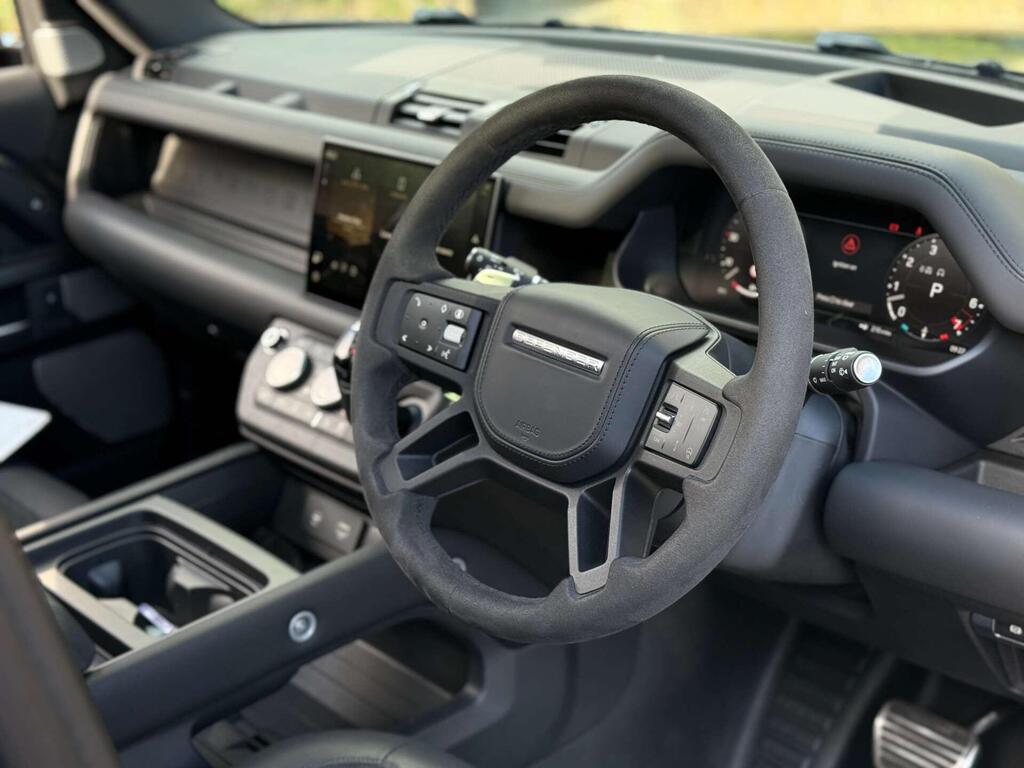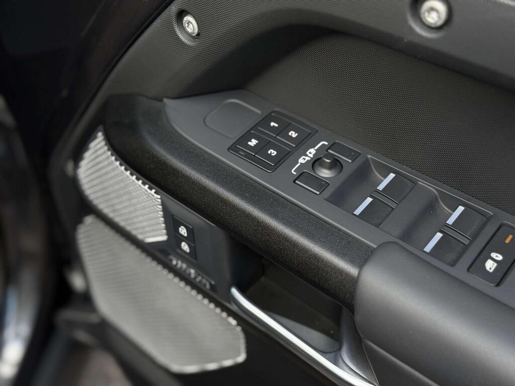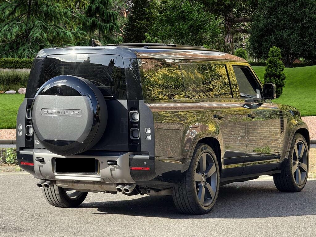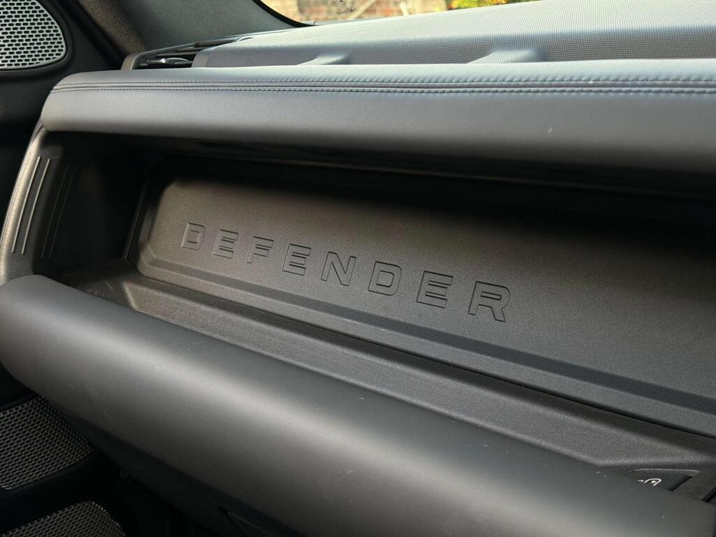 Land Rover Defender 130 5.0 P500 V8 4WD Panoramic Sunroof на 22-дюймовых легкосплавных дисках Style 5098 — 5 спиц — темно-серый сатиновый, 14-позиционные передние сиденья с электроприводом, подогревом и вентиляцией, памятью настроек и 4-позиционными подголовниками с механической регулировкой, подогрев рулевого колеса, холодильник в передней центральной консоли, четырехзонный климат-контроль, система помощи при парковке на 360 градусов, 3D-камера кругового обзора, адаптивный круиз-контроль ACC, система помощи при слепых зонах, проекционный дисплей, распознавание дорожных знаков и адаптивный ограничитель скорости, Apple CarPlay, аудиосистема Meridian, беспроводная зарядка устройств, 11,4-дюймовый сенсорный экран.