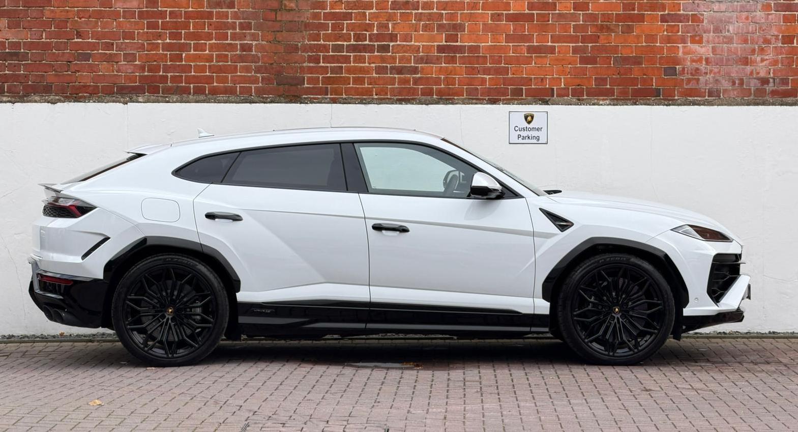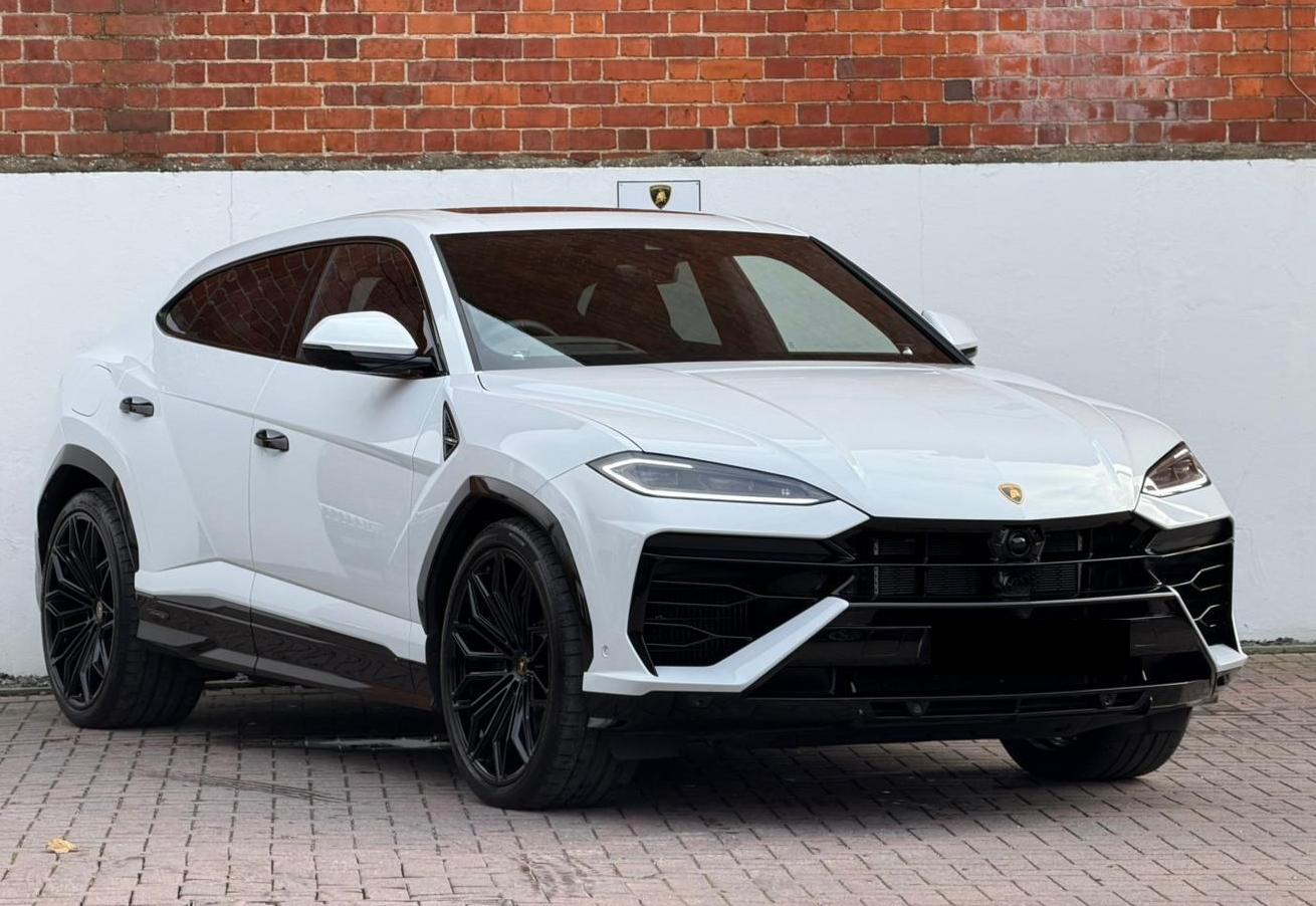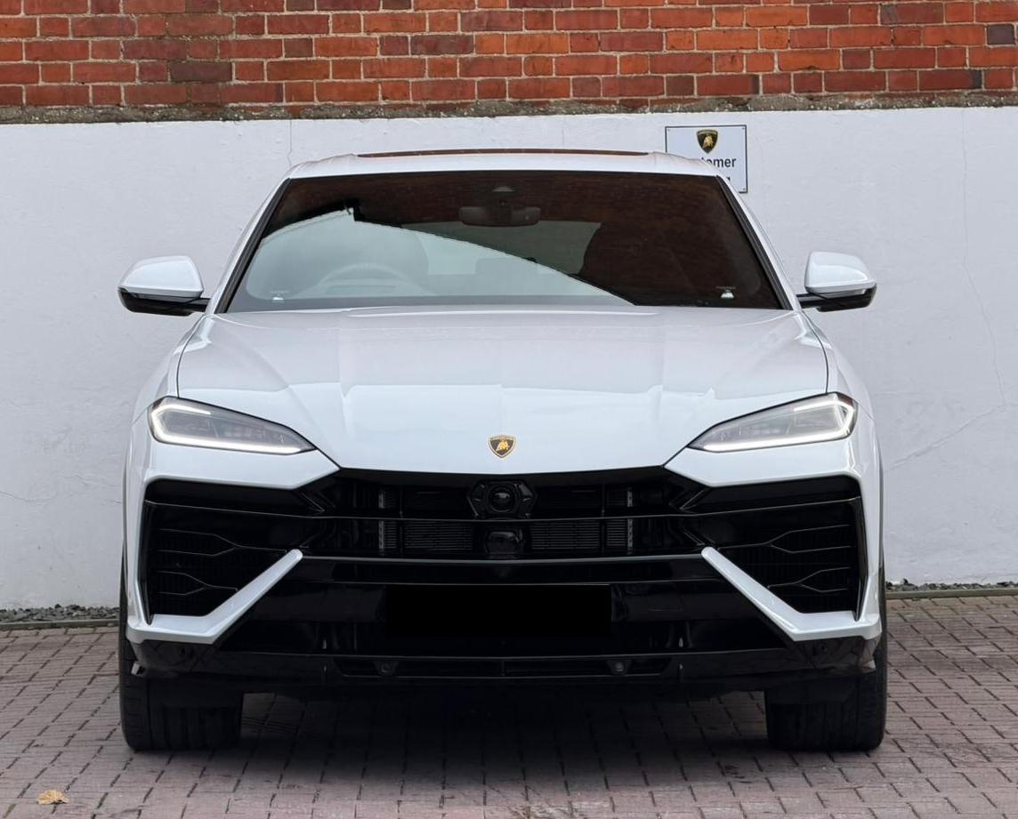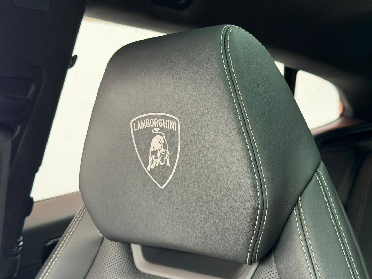 Lamborghini Urus 4.0 V8 BiTurbo 25.9kWh SE Panoramic Sunroof на 23-дюймовых легкосплавных дисках Galanthus Shiny Black Rims Экстерьер: пакет подсветки салона, аудиосистема Bang and Olufsen Advanced 3D, черное анодированное покрытие алюминиевых вставок, черные матовые выхлопные трубы Ad Personam, блестящие дверные ручки, вышитый логотип на подголовниках, полностью электрические передние сиденья с вентиляцией и массажем, темный пакет отделки салона, логотип Lamborghini сзади в глянцевом черном цвете Ad Personam, задний спойлер в глянцевом черном цвете, пакет Style (полностью в глянцевом черном цвете), система отслеживания скорости VTS, 4.0-литровый двигатель V8 BiTurbo 25,9 кВт⋅ч SE SUV, 5-дверный бензиновый гибрид с автоматическим переключением передач и полным приводом Euro 6 (797 л.с.).