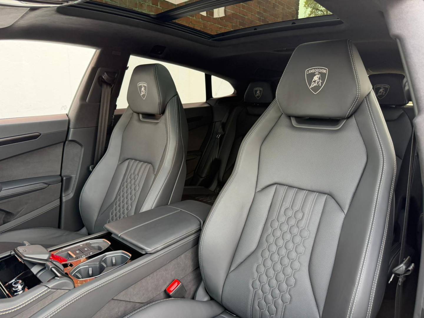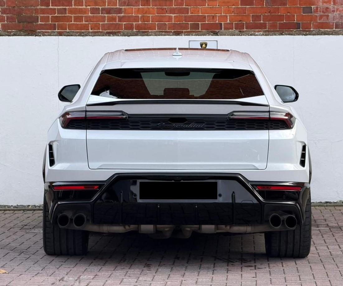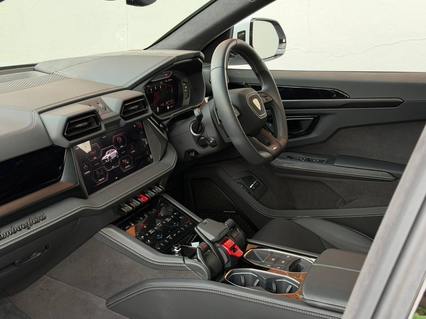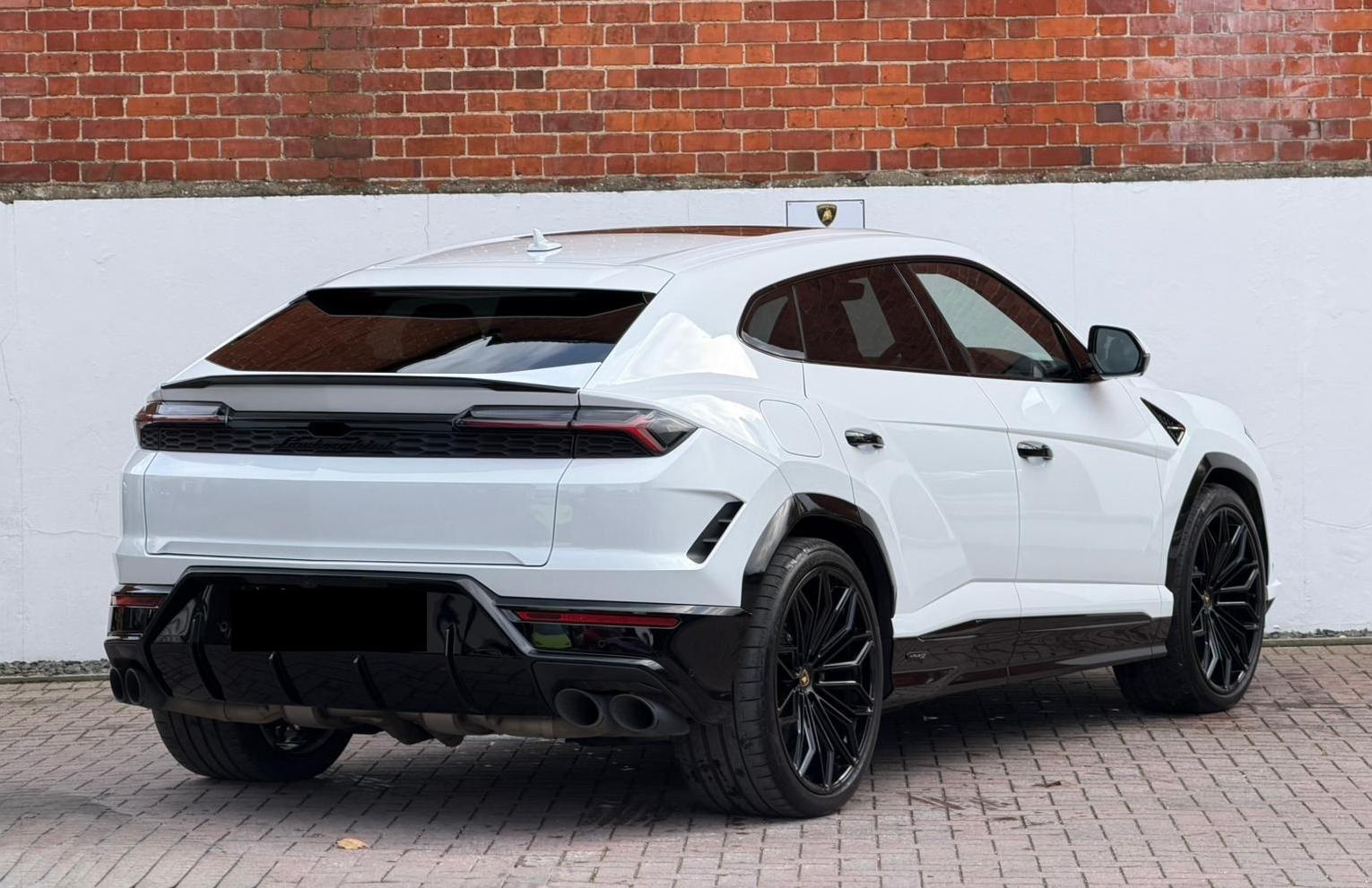 Lamborghini Urus 4.0 V8 BiTurbo 25.9kWh SE Panoramic Sunroof на 23-дюймовых легкосплавных дисках Galanthus Shiny Black Rims Экстерьер: пакет подсветки салона, аудиосистема Bang and Olufsen Advanced 3D, черное анодированное покрытие алюминиевых вставок, черные матовые выхлопные трубы Ad Personam, блестящие дверные ручки, вышитый логотип на подголовниках, полностью электрические передние сиденья с вентиляцией и массажем, темный пакет отделки салона, логотип Lamborghini сзади в глянцевом черном цвете Ad Personam, задний спойлер в глянцевом черном цвете, пакет Style (полностью в глянцевом черном цвете), система отслеживания скорости VTS, 4.0-литровый двигатель V8 BiTurbo 25,9 кВт⋅ч SE SUV, 5-дверный бензиновый гибрид с автоматическим переключением передач и полным приводом Euro 6 (797 л.с.).