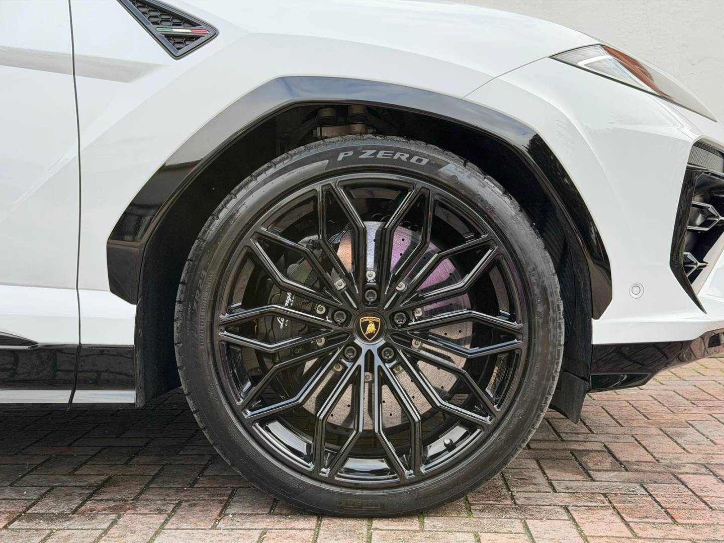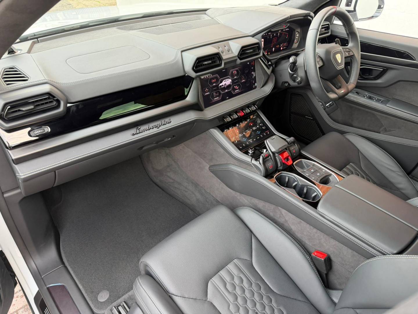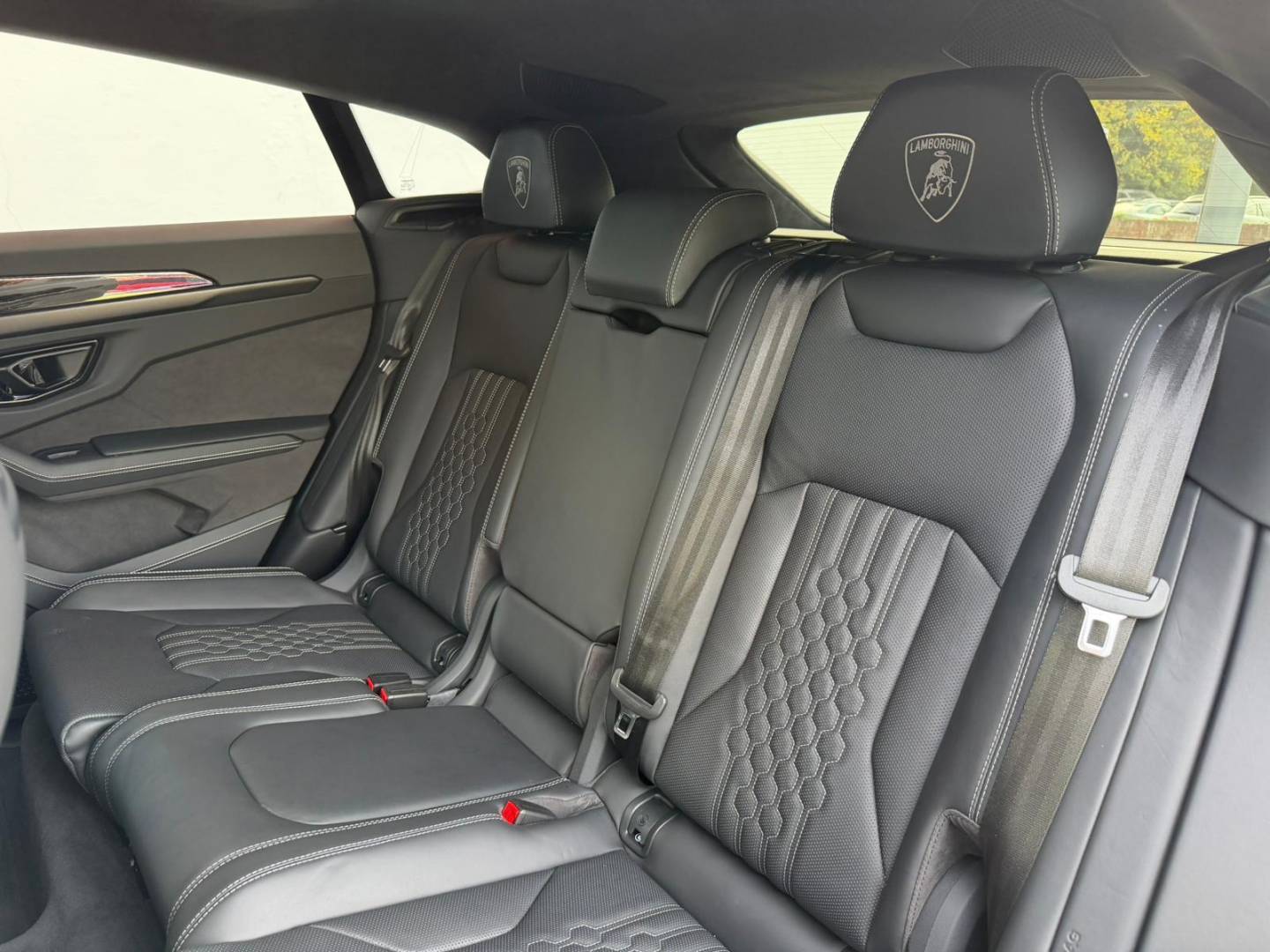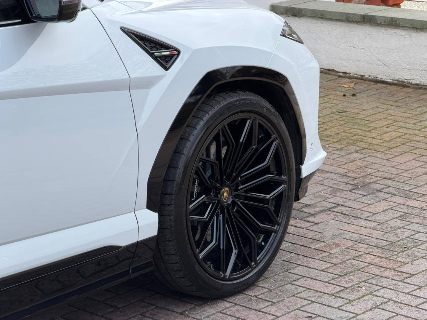Lamborghini Urus 4.0 V8 BiTurbo 25.9kWh SE Panoramic Sunroof на 23-дюймовых легкосплавных дисках Galanthus Shiny Black Rims Экстерьер: пакет подсветки салона, аудиосистема Bang and Olufsen Advanced 3D, черное анодированное покрытие алюминиевых вставок, черные матовые выхлопные трубы Ad Personam, блестящие дверные ручки, вышитый логотип на подголовниках, полностью электрические передние сиденья с вентиляцией и массажем, темный пакет отделки салона, логотип Lamborghini сзади в глянцевом черном цвете Ad Personam, задний спойлер в глянцевом черном цвете, пакет Style (полностью в глянцевом черном цвете), система отслеживания скорости VTS, 4.0-литровый двигатель V8 BiTurbo 25,9 кВт⋅ч SE SUV, 5-дверный бензиновый гибрид с автоматическим переключением передач и полным приводом Euro 6 (797 л.с.).