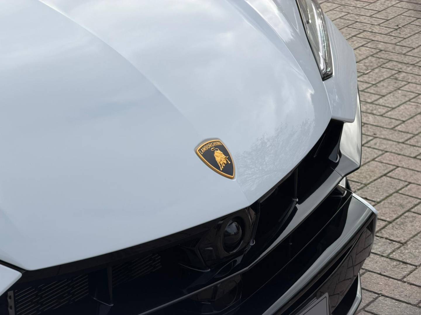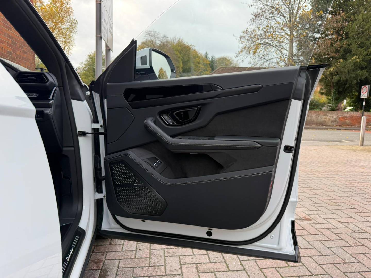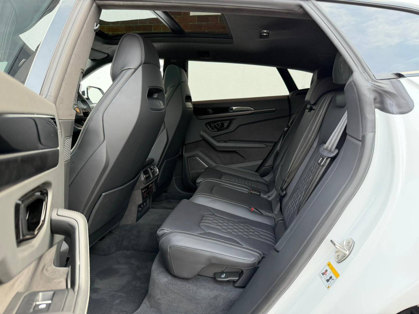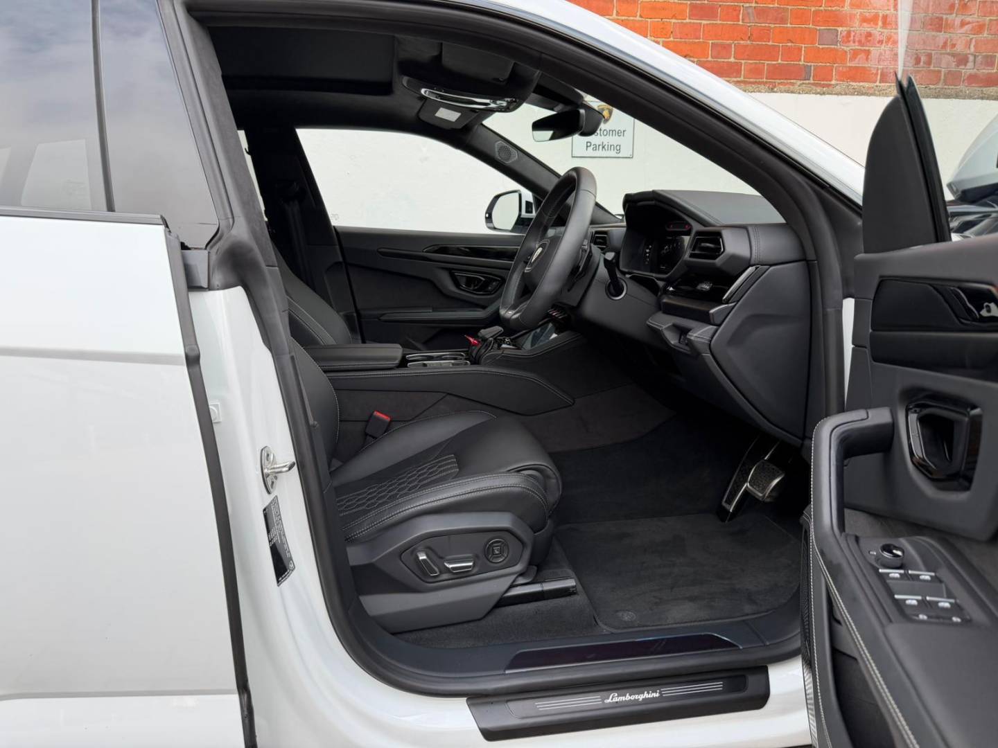 Lamborghini Urus 4.0 V8 BiTurbo 25.9kWh SE Panoramic Sunroof на 23-дюймовых легкосплавных дисках Galanthus Shiny Black Rims Экстерьер: пакет подсветки салона, аудиосистема Bang and Olufsen Advanced 3D, черное анодированное покрытие алюминиевых вставок, черные матовые выхлопные трубы Ad Personam, блестящие дверные ручки, вышитый логотип на подголовниках, полностью электрические передние сиденья с вентиляцией и массажем, темный пакет отделки салона, логотип Lamborghini сзади в глянцевом черном цвете Ad Personam, задний спойлер в глянцевом черном цвете, пакет Style (полностью в глянцевом черном цвете), система отслеживания скорости VTS, 4.0-литровый двигатель V8 BiTurbo 25,9 кВт⋅ч SE SUV, 5-дверный бензиновый гибрид с автоматическим переключением передач и полным приводом Euro 6 (797 л.с.).