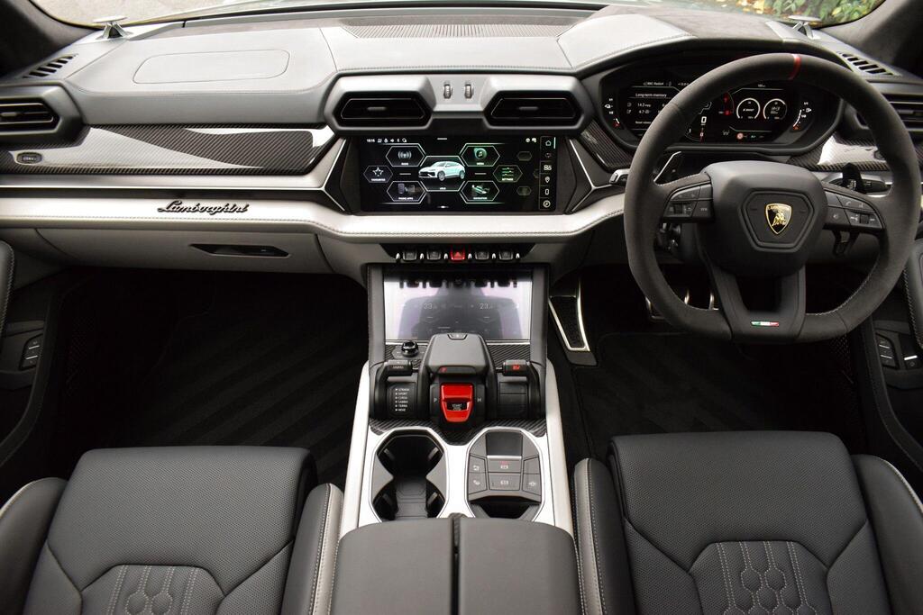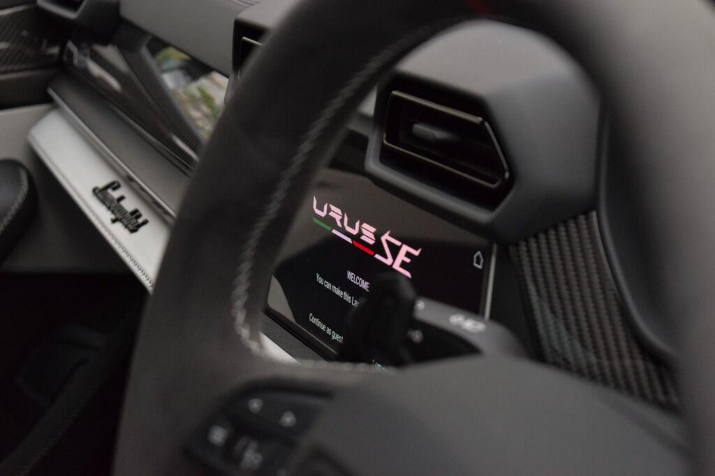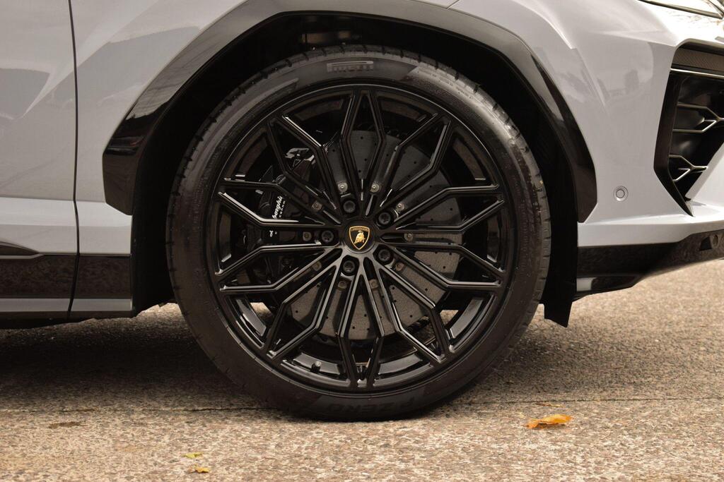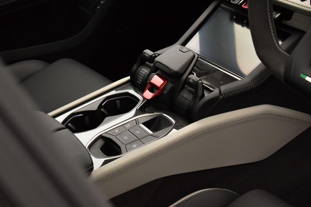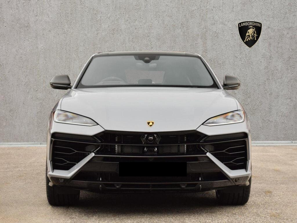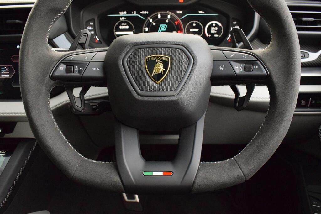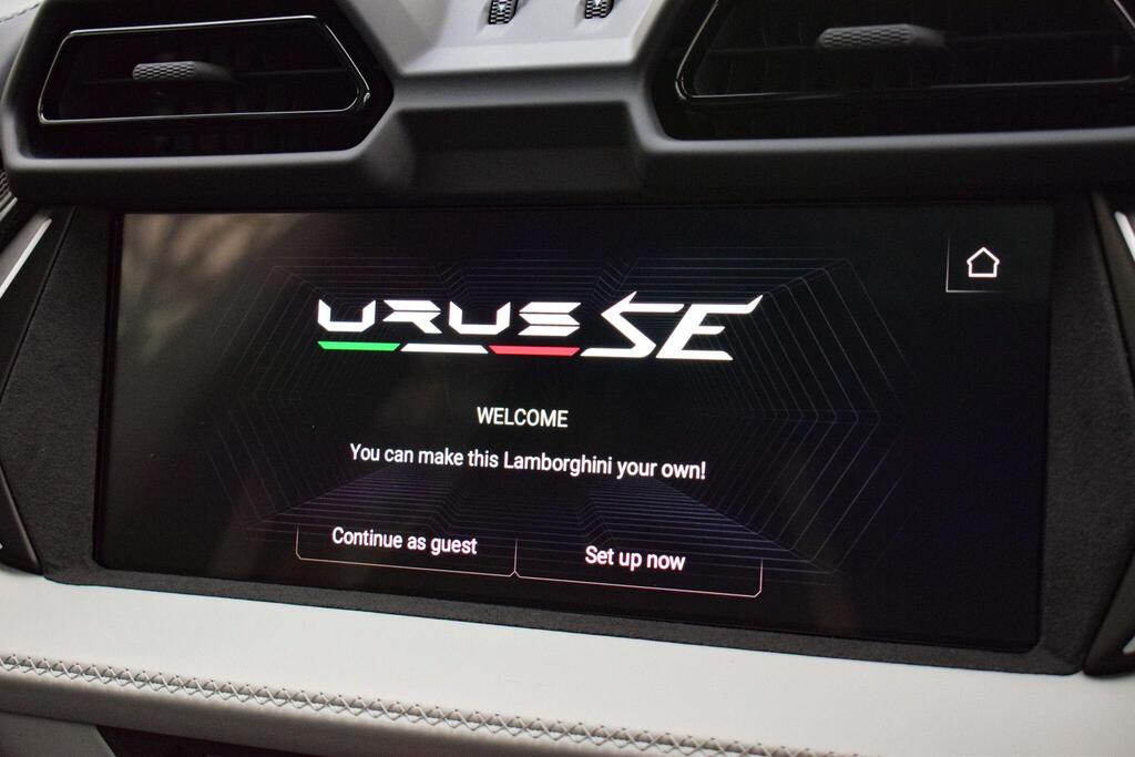 Lamborghini Urus 4.0 V8 BiTurbo 25.9kWh SE Panoramic Sunroof на 23-дюймовых глянцево-черных дисках Galanthus, черные тормозные суппорты, глянцевая черная крыша с панорамным люком, пакет Small Interior Gloss Carbon, пакет помощи при парковке с дистанционным управлением, звуковая система Bang & Olufsen, полностью электрические передние сиденья с вентиляцией и массажем, подогрев передних и задних сидений, двухцветный кожаный салон с контрастной строчкой, прострочка кожаных сидений Performante, подогреваемый руль Corsa Tex с красной меткой, коврики с двойной строчкой и кожаной окантовкой, серебристые ремни безопасности Grigio, 21-дюймовое запасное колесо, подогреваемое и теплоотражающее лобовое стекло, заднее звукопоглощающее стекло, пакет внешнего тюнинга Gloss Black, глянцевый черный задний спойлер и дверные ручки Ad_Personam, корпуса боковых зеркал из глянцевого углеродного волокна, глянцевый черный задний логотип Lamborghini, матовые черные выхлопные насадки, вышитые щитки Lamborghini, пакет фоновой подсветки, пакет темного интерьера, крестообразная строчка в салоне, внедорожные режимы Lamborghini ANIMA, черная анодированная отделка салона с лазерной гравировкой буквы Y на приборной панели.