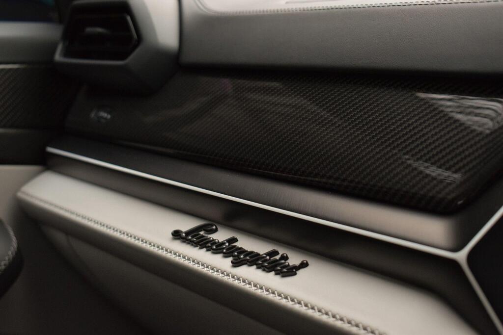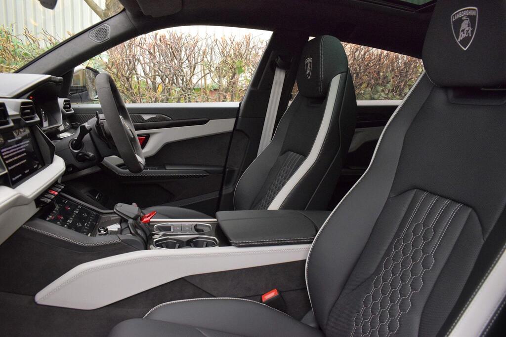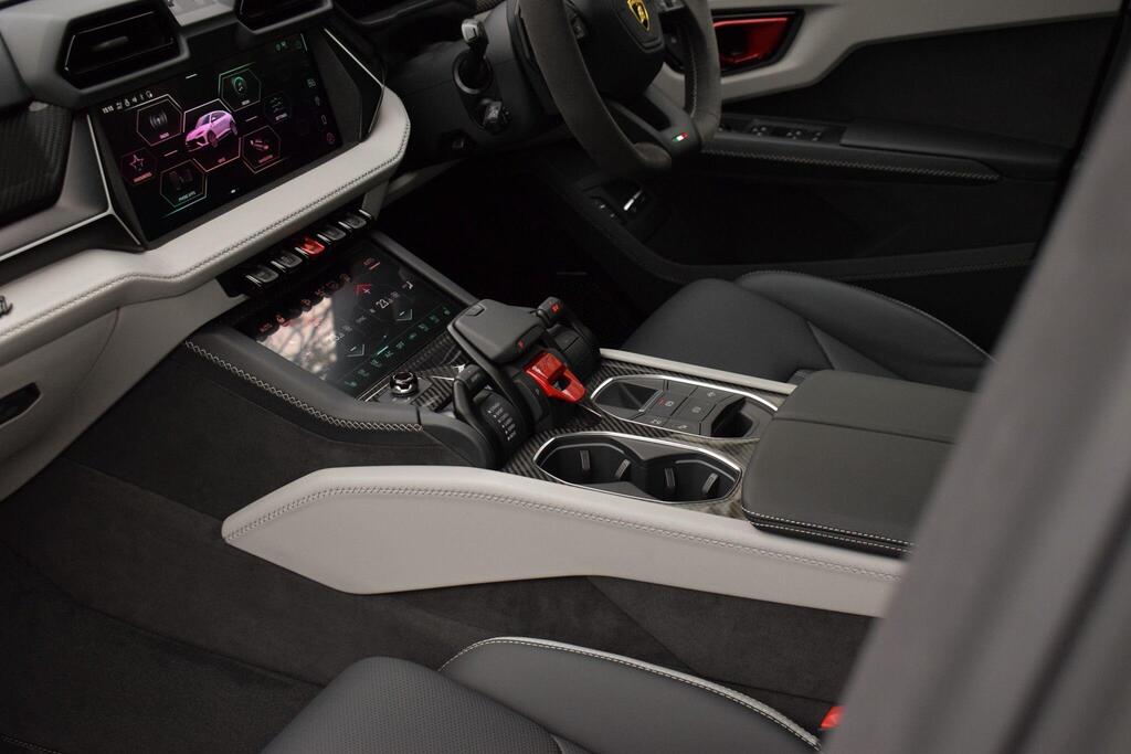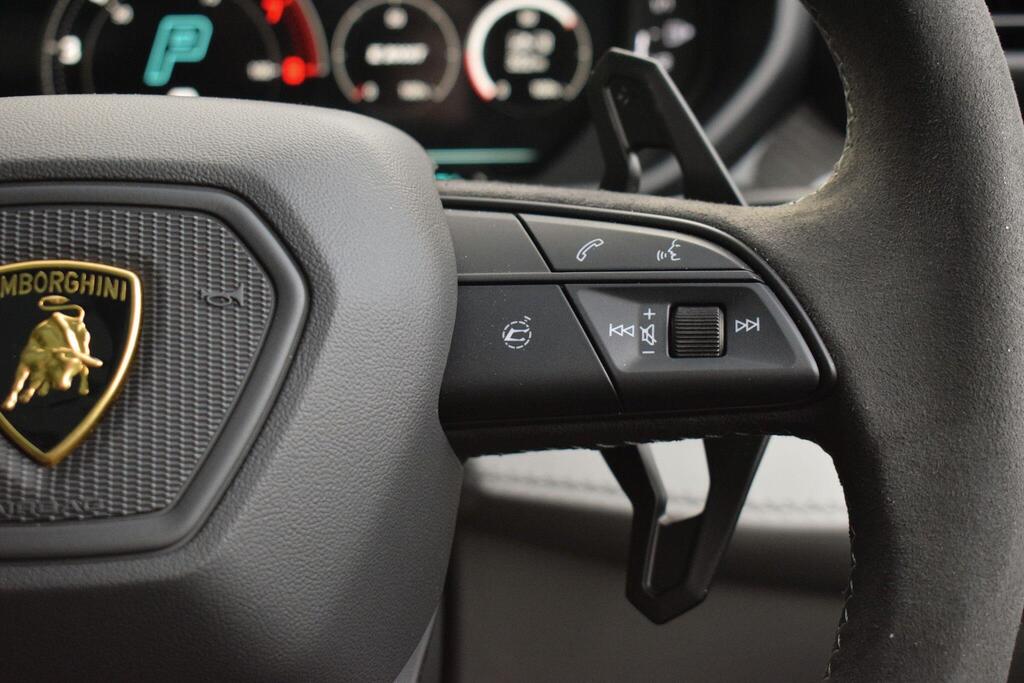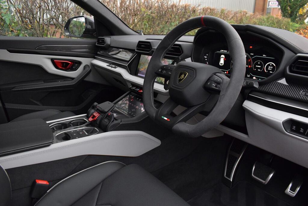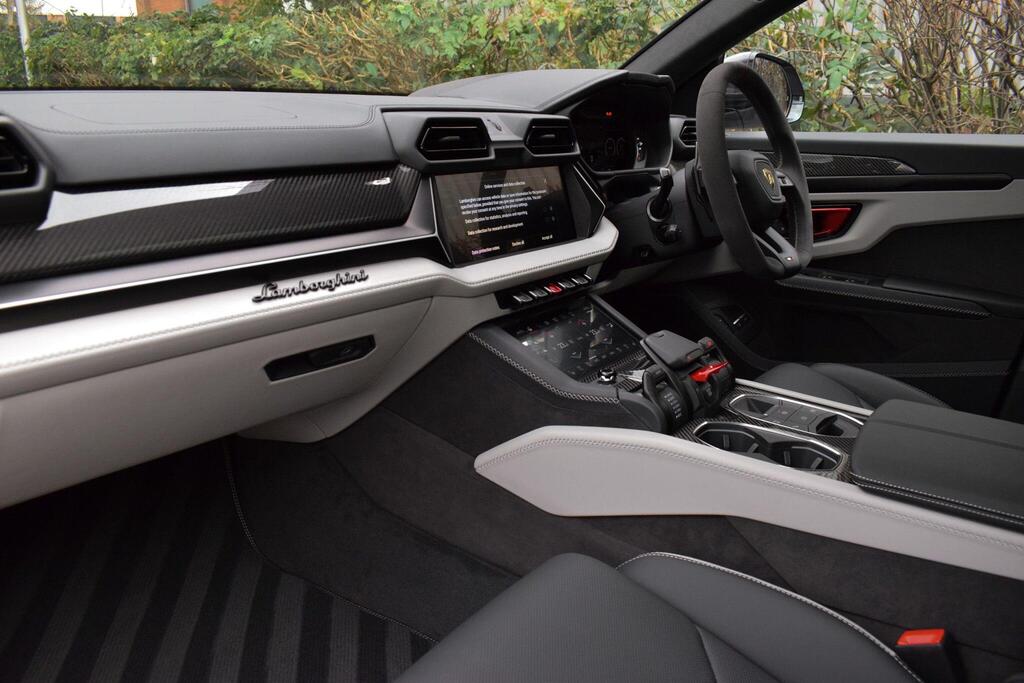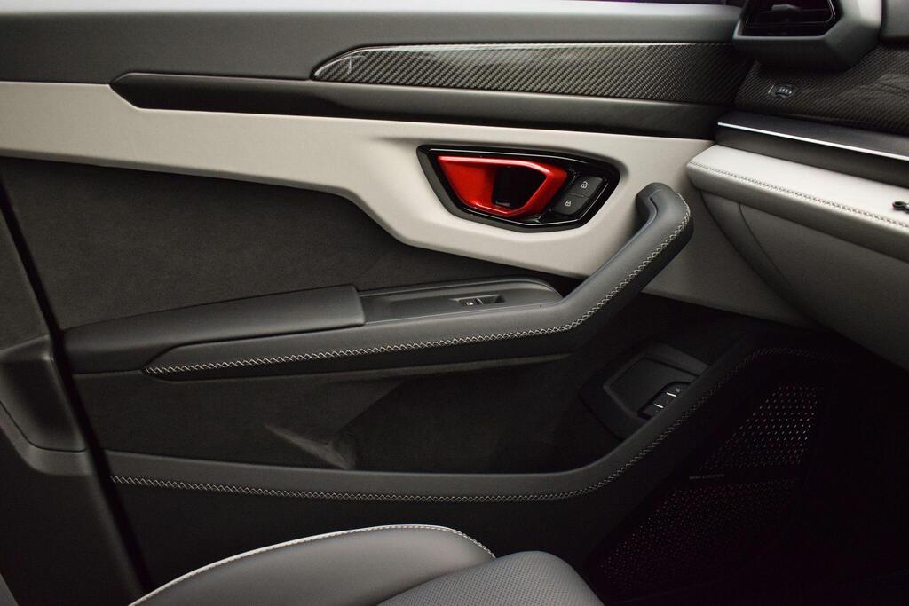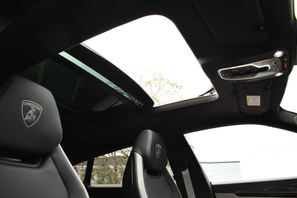 Lamborghini Urus 4.0 V8 BiTurbo 25.9kWh SE Panoramic Sunroof на 23-дюймовых глянцево-черных дисках Galanthus, черные тормозные суппорты, глянцевая черная крыша с панорамным люком, пакет Small Interior Gloss Carbon, пакет помощи при парковке с дистанционным управлением, звуковая система Bang & Olufsen, полностью электрические передние сиденья с вентиляцией и массажем, подогрев передних и задних сидений, двухцветный кожаный салон с контрастной строчкой, прострочка кожаных сидений Performante, подогреваемый руль Corsa Tex с красной меткой, коврики с двойной строчкой и кожаной окантовкой, серебристые ремни безопасности Grigio, 21-дюймовое запасное колесо, подогреваемое и теплоотражающее лобовое стекло, заднее звукопоглощающее стекло, пакет внешнего тюнинга Gloss Black, глянцевый черный задний спойлер и дверные ручки Ad_Personam, корпуса боковых зеркал из глянцевого углеродного волокна, глянцевый черный задний логотип Lamborghini, матовые черные выхлопные насадки, вышитые щитки Lamborghini, пакет фоновой подсветки, пакет темного интерьера, крестообразная строчка в салоне, внедорожные режимы Lamborghini ANIMA, черная анодированная отделка салона с лазерной гравировкой буквы Y на приборной панели.