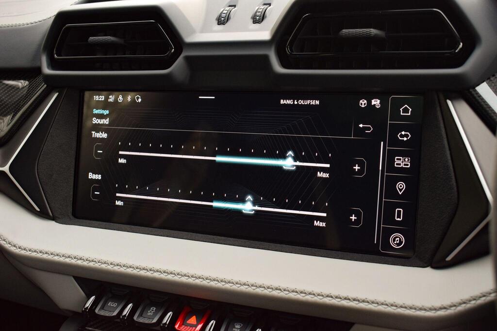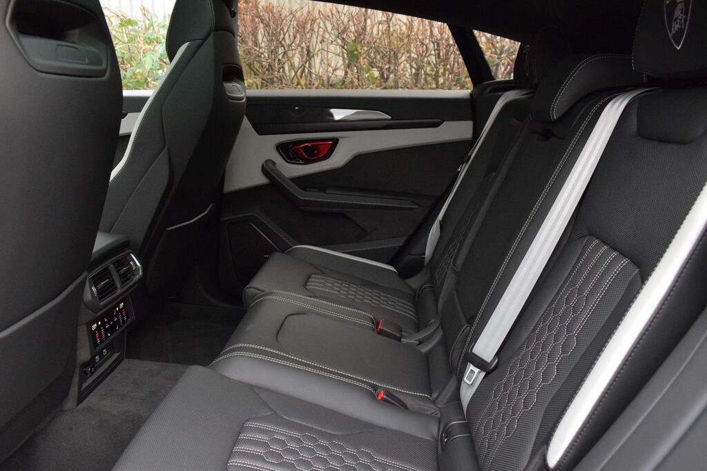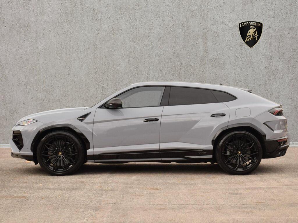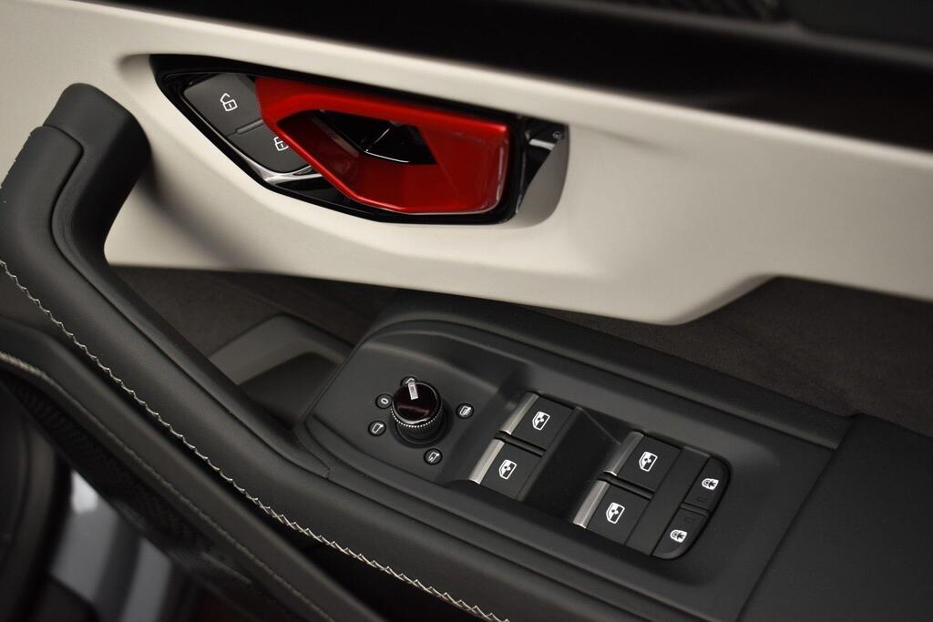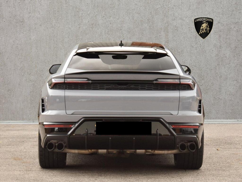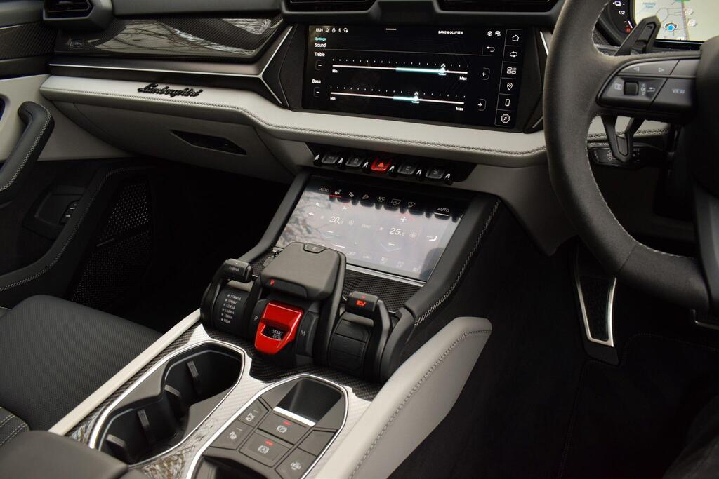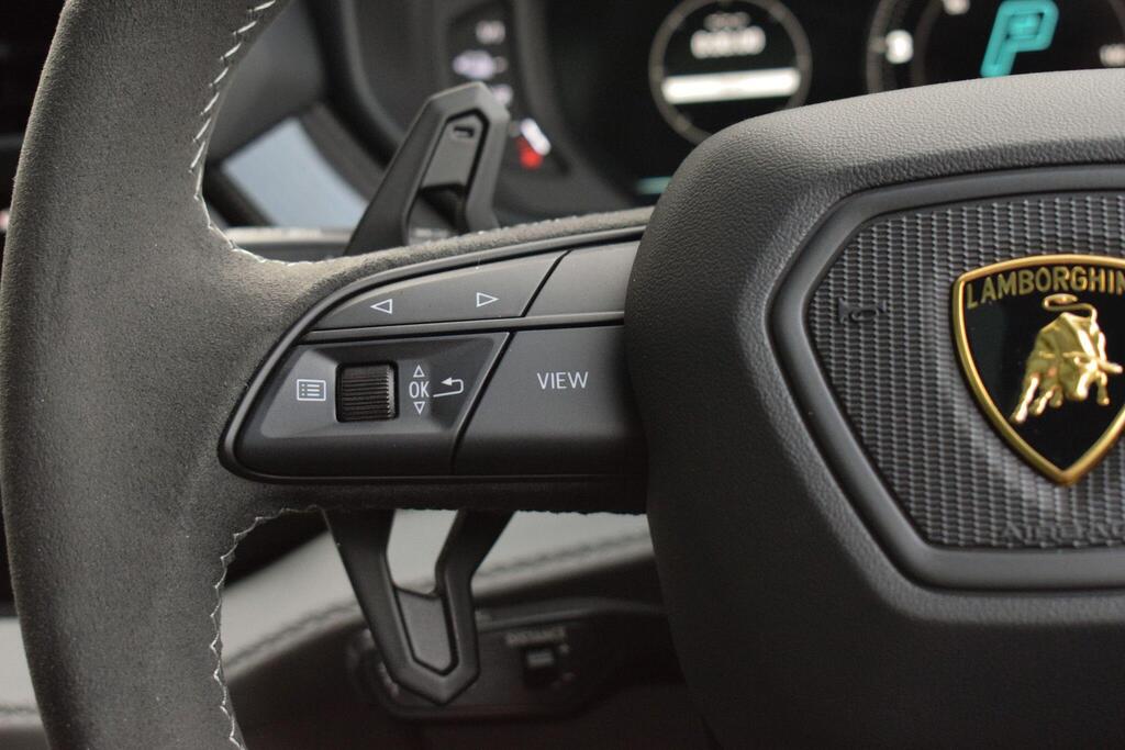 Lamborghini Urus 4.0 V8 BiTurbo 25.9kWh SE Panoramic Sunroof на 23-дюймовых глянцево-черных дисках Galanthus, черные тормозные суппорты, глянцевая черная крыша с панорамным люком, пакет Small Interior Gloss Carbon, пакет помощи при парковке с дистанционным управлением, звуковая система Bang & Olufsen, полностью электрические передние сиденья с вентиляцией и массажем, подогрев передних и задних сидений, двухцветный кожаный салон с контрастной строчкой, прострочка кожаных сидений Performante, подогреваемый руль Corsa Tex с красной меткой, коврики с двойной строчкой и кожаной окантовкой, серебристые ремни безопасности Grigio, 21-дюймовое запасное колесо, подогреваемое и теплоотражающее лобовое стекло, заднее звукопоглощающее стекло, пакет внешнего тюнинга Gloss Black, глянцевый черный задний спойлер и дверные ручки Ad_Personam, корпуса боковых зеркал из глянцевого углеродного волокна, глянцевый черный задний логотип Lamborghini, матовые черные выхлопные насадки, вышитые щитки Lamborghini, пакет фоновой подсветки, пакет темного интерьера, крестообразная строчка в салоне, внедорожные режимы Lamborghini ANIMA, черная анодированная отделка салона с лазерной гравировкой буквы Y на приборной панели.