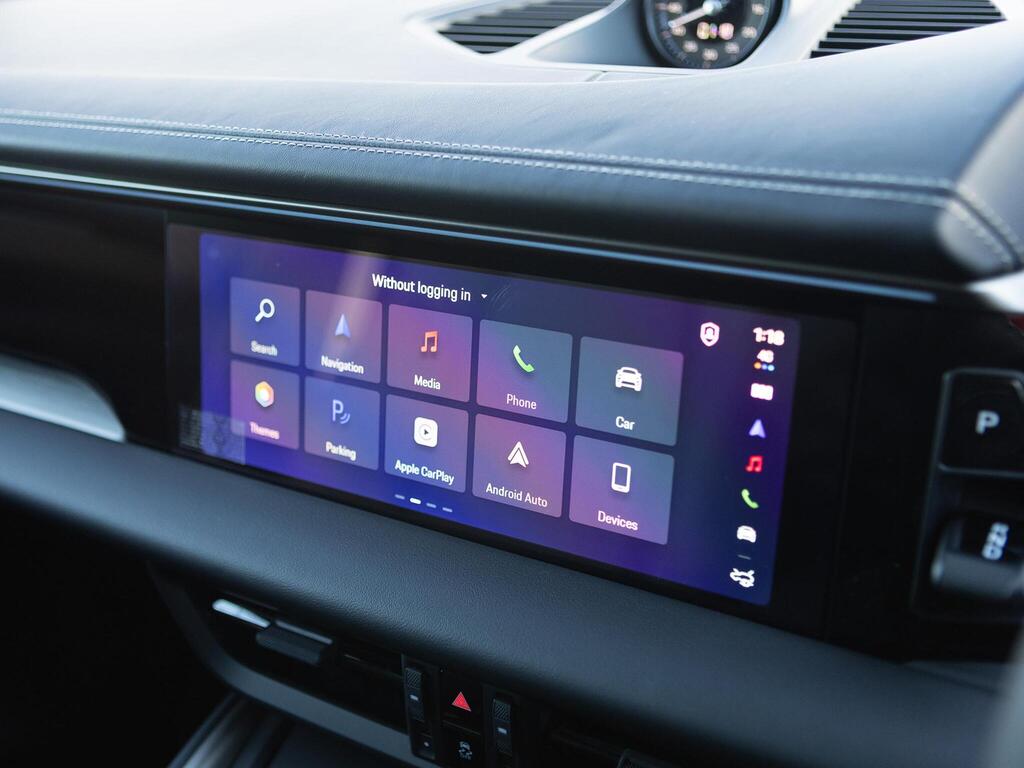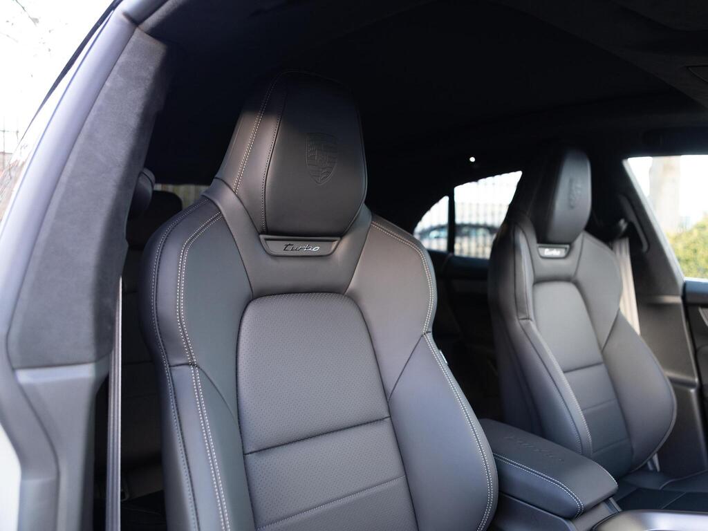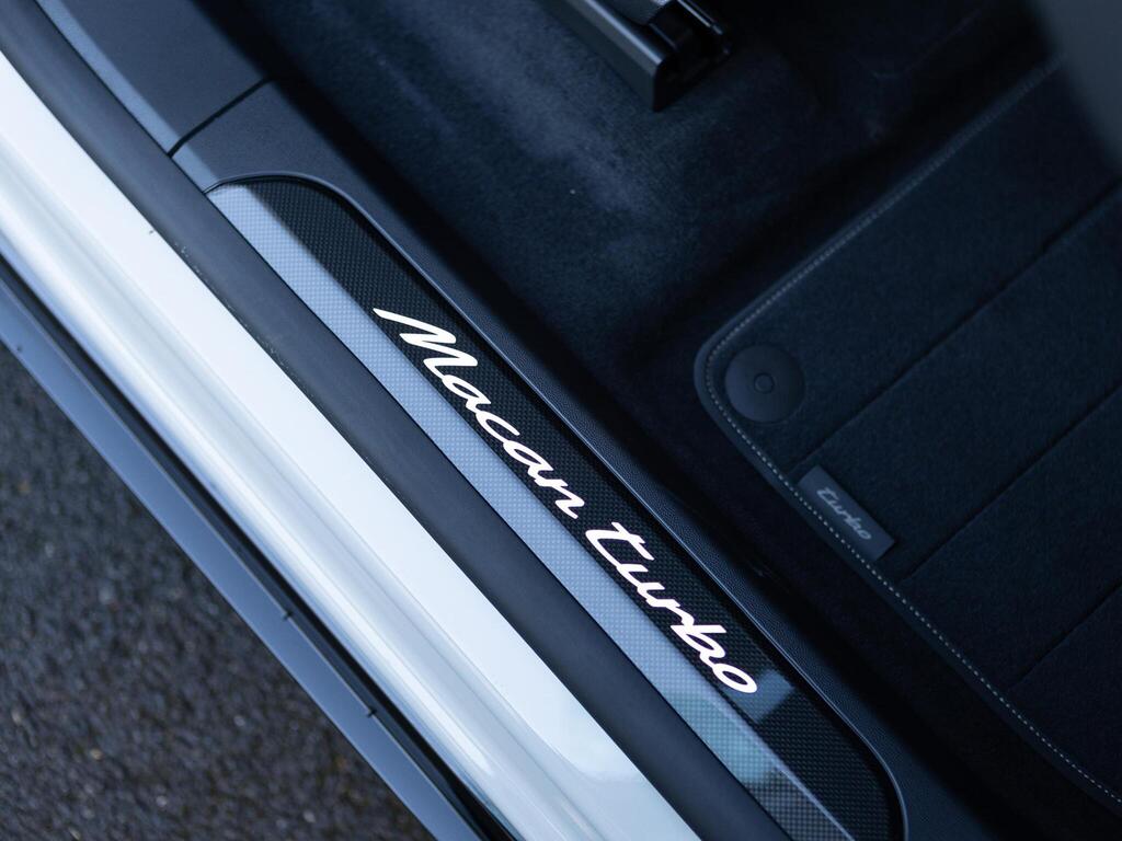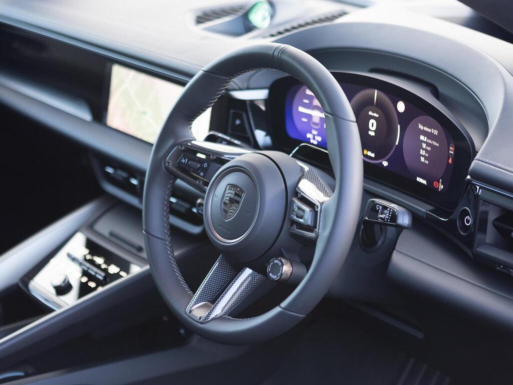 Porsche Macan 100kWh Turbo Panoramic Sunroof на 20-дюймовых легкосплавных дисках - Macan Turbo, адаптивные спортивные сиденья спереди с 18-позиционной электрорегулировкой, кожаный спортивный руль GT с подогревом и переключателем режимов, отделка салона - карбон, бесключевой доступ, подогрев руля, двухзонный автоматический климат-контроль, круиз-контроль. Система помощи водителю, система помощи при смене полосы движения, система помощи при парковке (передняя и задняя) с камерой заднего вида, система распознавания дорожных знаков, аудиосистема BOSE Surround Sound.