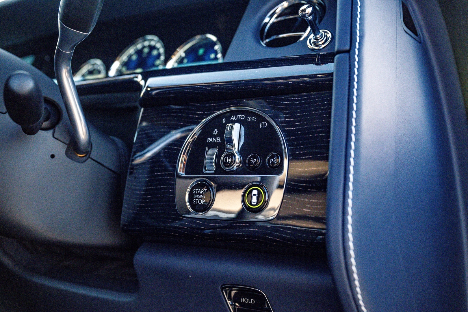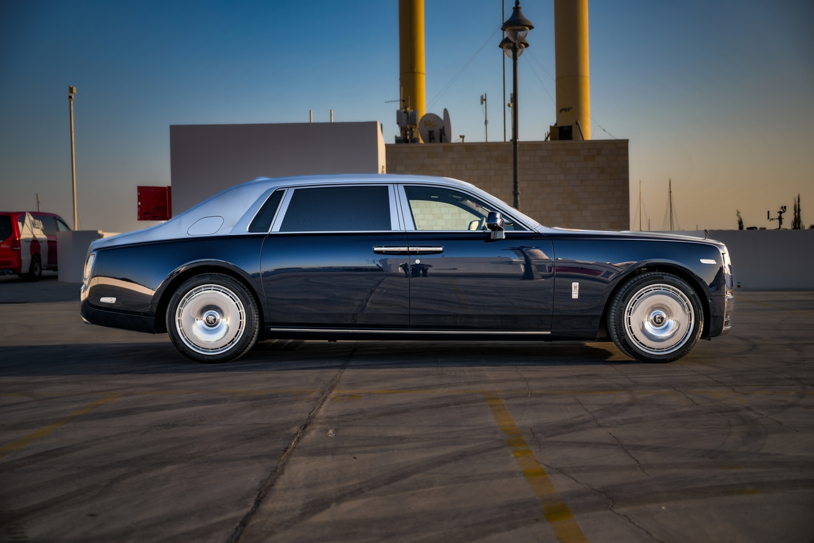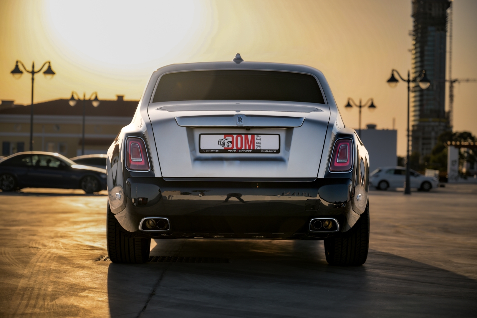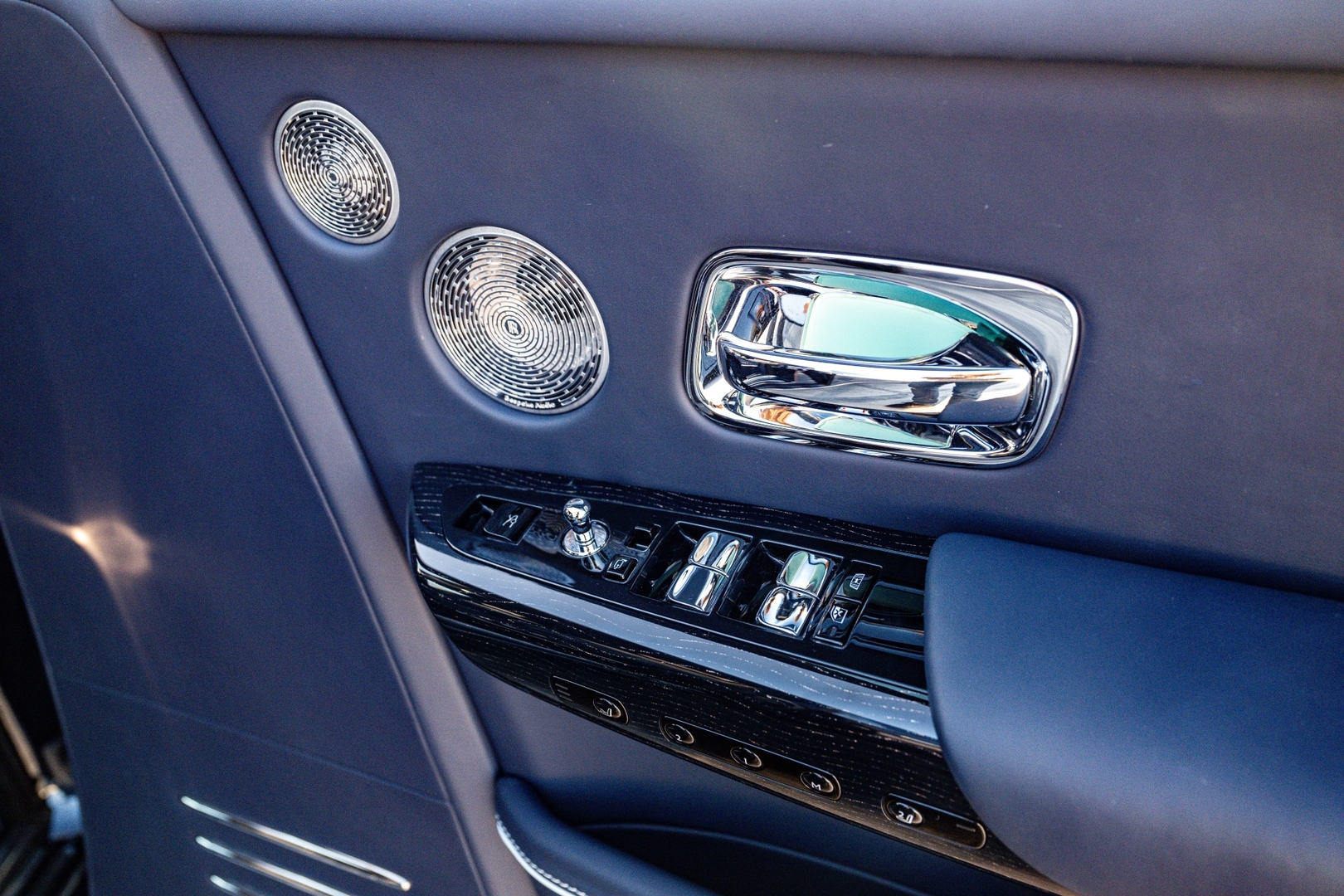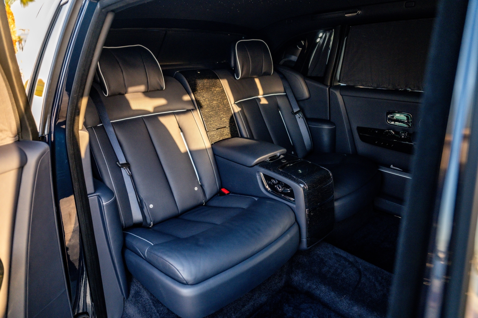 Rolls-Royce Phantom Extended 6.75 V12 на 22-дюймовых кованых полностью полированных дисках , хромированные видимые выхлопные трубки, вентилируемые передние и задние сиденья, спицы рулевого колеса с отделкой шпоном, откидные столики для пикника с отделкой шпоном, потолок с отделкой «Падающая звезда», индивидуальная конфигурация сидений, передние и задние сиденья с функцией массажа, система комфортного доступа, задние тонированные стекла, задняя конфигурация под TV, шторки в багажном отделении, аудиосистема Rolls-Royce Bespoke, системы помощи водителю, активный круиз-контроль, система помощи при переключении дальнего света, проекционный дисплей, фиксированная центральная консоль для задних сидений.