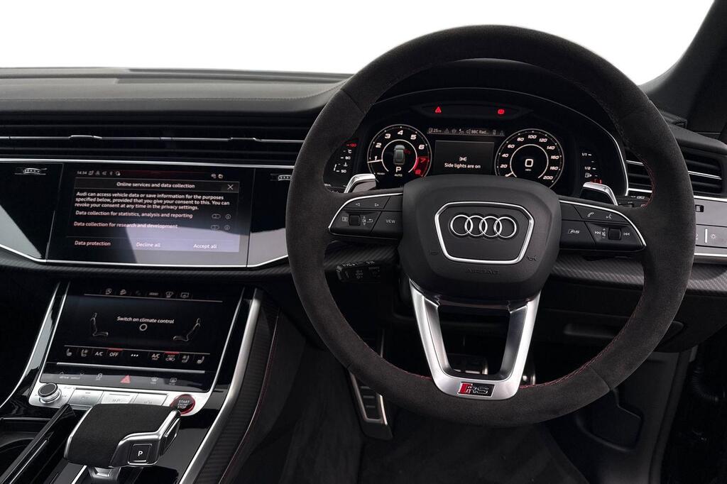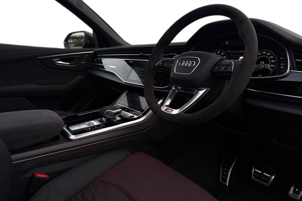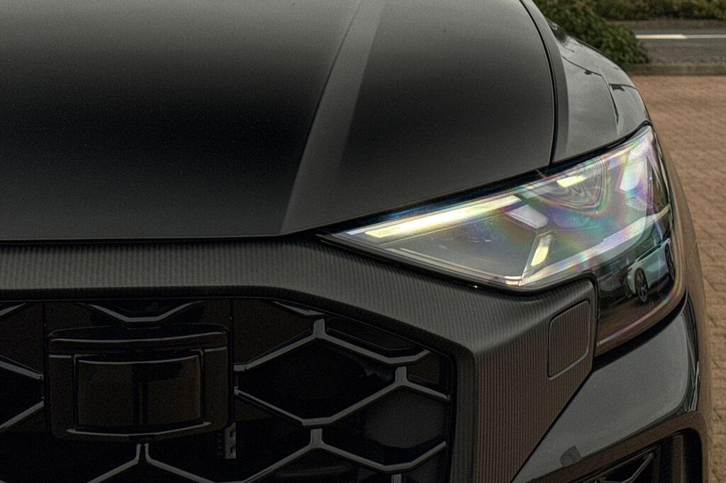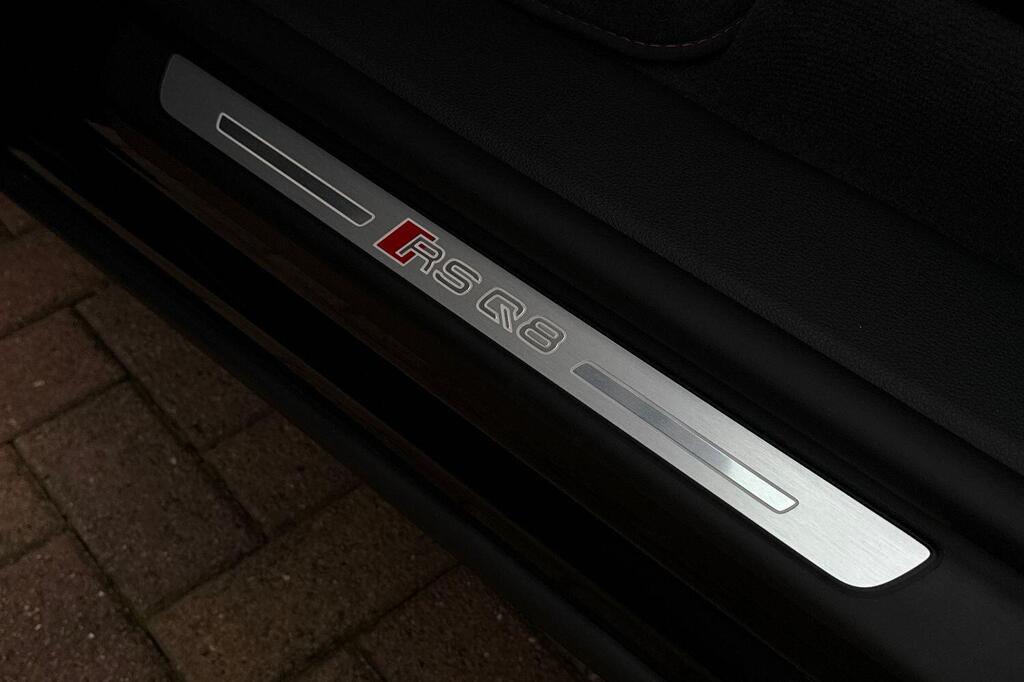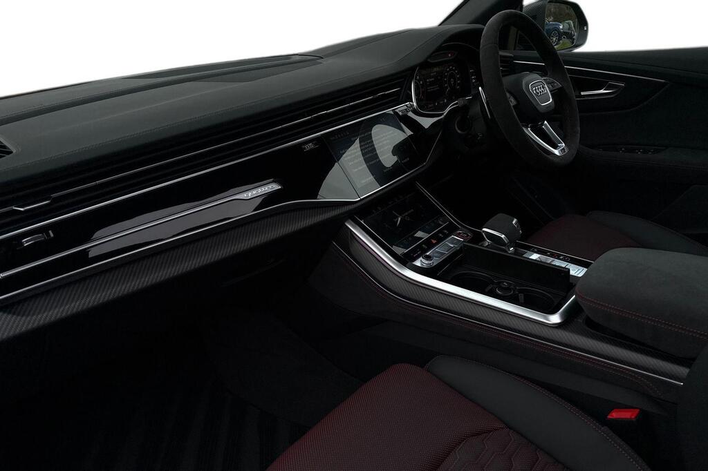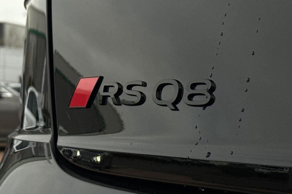 Audi RSQ8 V8 Performance Carbon Vorsprung 4.0 TFSI Tiptronic quattro Panoramic Sunroof на 23-дюймовых легкосплавных дисках - 5-Y-спицевые - Audi Sport - матовый контрастный черный цвет, пакет отделки Matt Carbon Black, пакет RS Design Pack Plus - красный цвет, боковые зеркала с электрорегулировкой, подогревом, складыванием, автоматическим затемнением, функцией памяти и встроенными светодиодными указателями поворота с функцией обзора бордюра для пассажирской стороны, светодиодная проекция логотипа RS Performance при открытии передних и задних боковых дверей, выхлопная система RS Sport с черными патрубками, 4-позиционная поясничная поддержка передних сидений, 4-зонный автоматический кондиционер, ионизатор и ароматизатор воздуха, вентиляция передних сидений, подогрев передних сидений, пакет Technology Pack Pro, многофункциональный спортивный руль RS с 3 спицами, подогревом, кожаной обивкой, подрулевыми переключателями и кнопкой RS Mode, камера кругового обзора 360 градусов. Адаптивный круиз-контроль с функцией экстренного торможения, распознавание дорожной обстановки на основе камер, распознавание дорожных знаков, проекционный дисплей, система предупреждения о выезде из полосы движения, распознавание естественной речи, система помощи при парковке. Кроме того, система парковки Plus с обзором на 360 градусов, передние, задние и боковые датчики, премиальная аудиосистема Bang and Olufsen 3D.