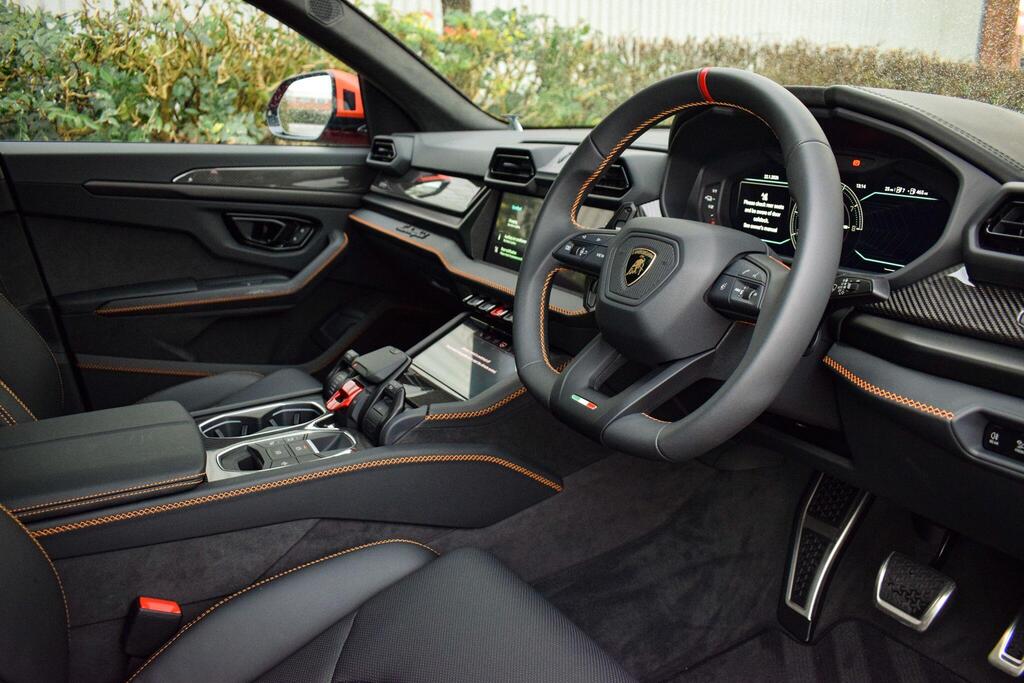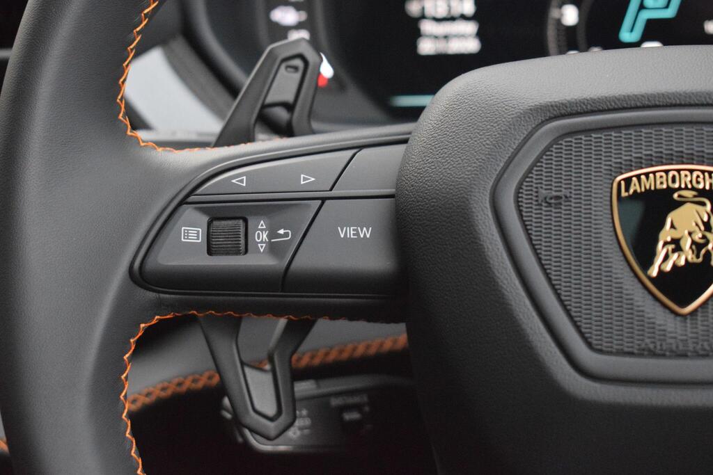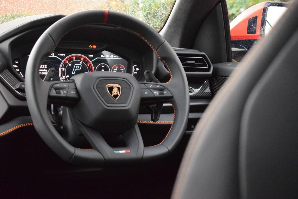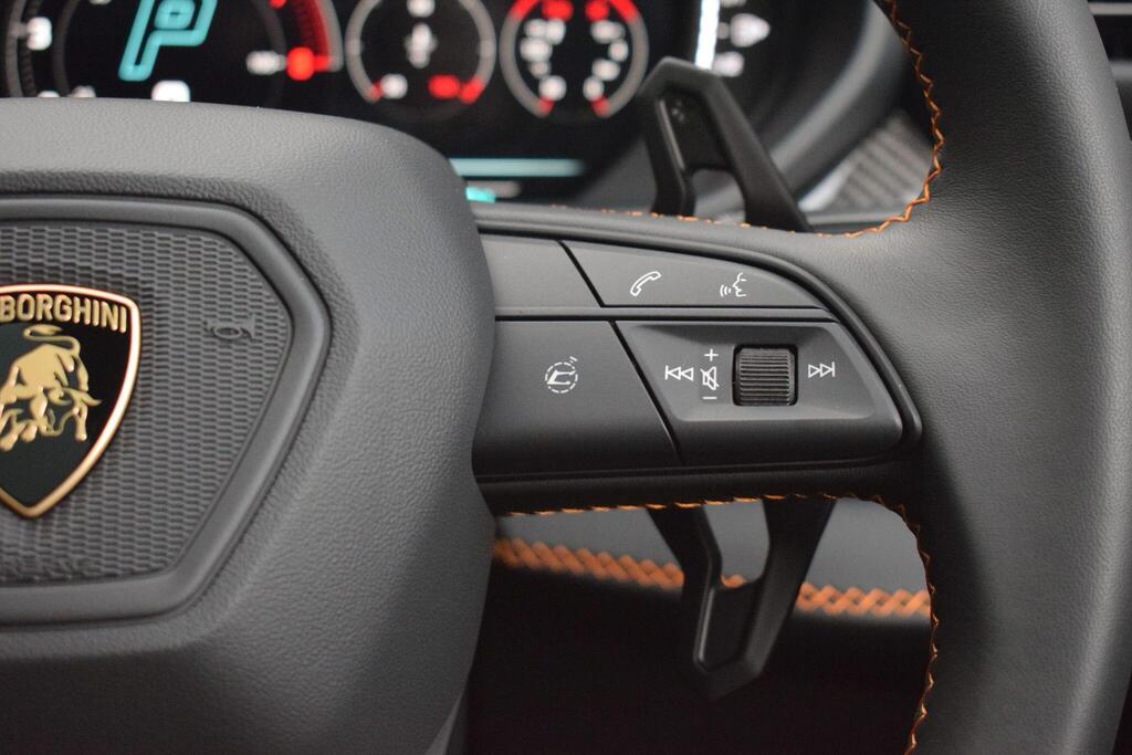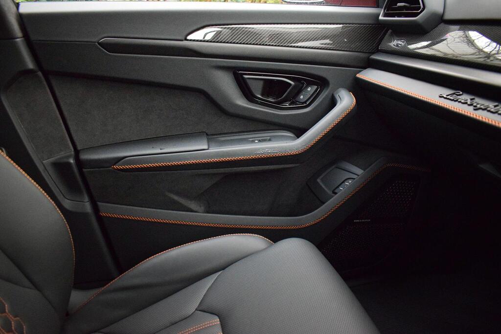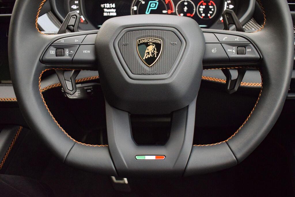 Lamborghini Urus 4.0 V8 BiTurbo 25.9kWh SE Panoramic Sunroof на 23-дюймовых легкосплавных дисках Ad Personam - глянцевые черные диски Taigete с алмазной отделкой, аудиосистема Bang and Olufsen Advanced 3D, матовые черные выхлопные патрубки, черные тормозные суппорты, пакет помощи при парковке с дистанционным управлением, пакет подсветки салона, аудиосистема Bang and Olufsen Advanced 3D. Электрические, вентилируемые и массажные передние сиденья, темный пакет отделки салона, кожаный руль с подогревом и X-образной строчкой, внутренняя отделка крестиком цвета Arancio Leonis, подогрев задних сидений, черные анодированные алюминиевые декоративные вставки, глянцевый черный логотип Lamborghini сзади, Lamborghini ANIMA, встроенные форсунки омывателя.