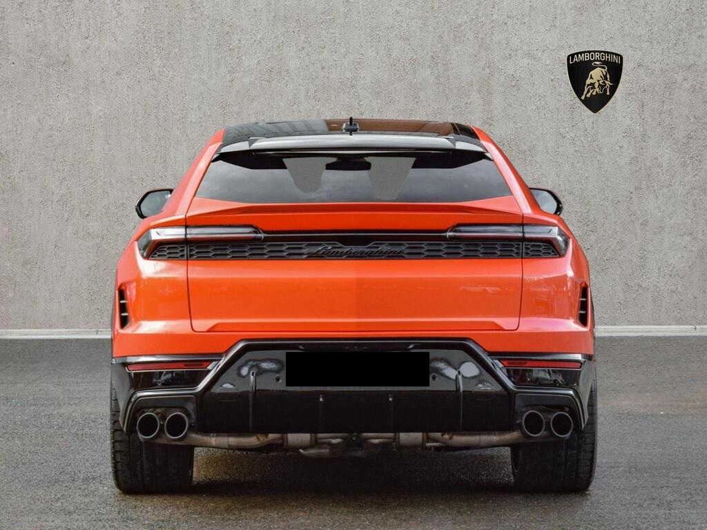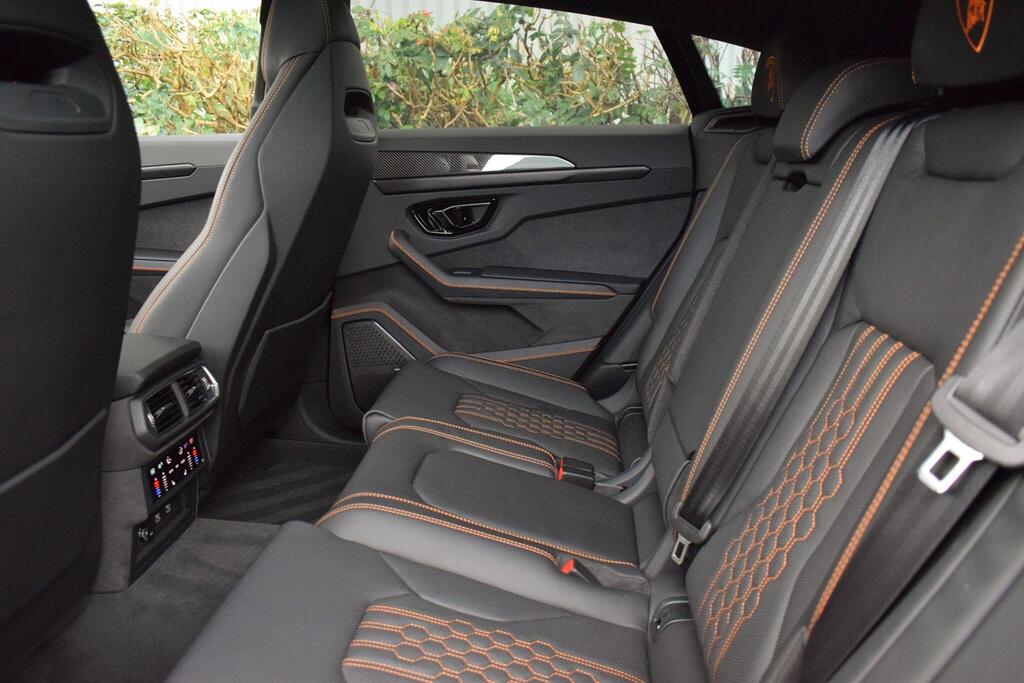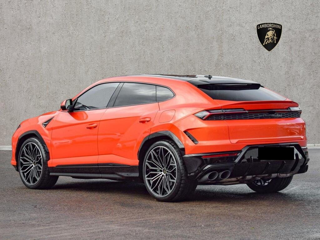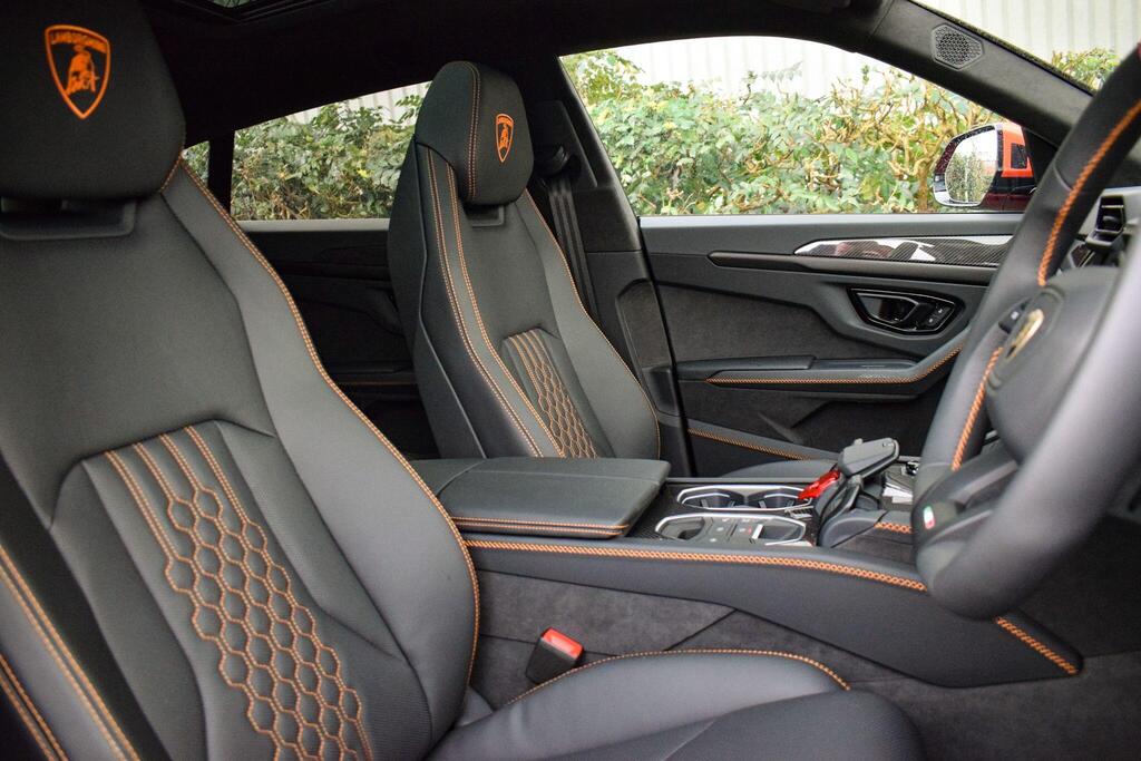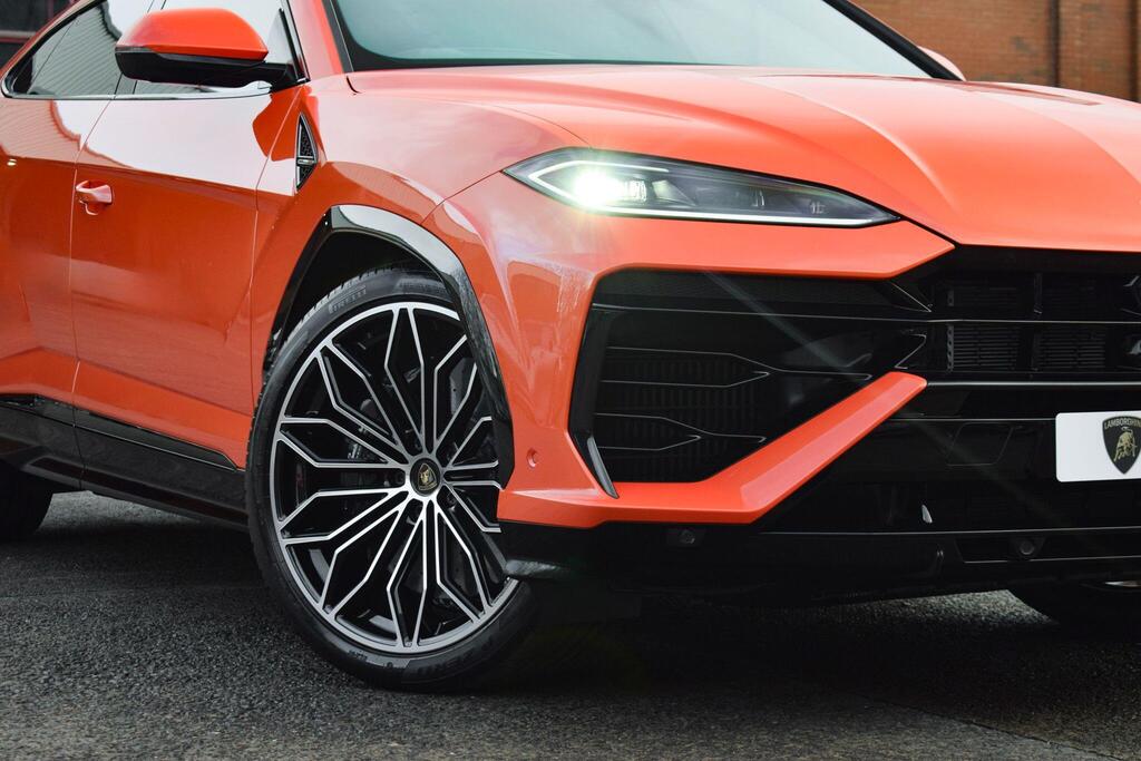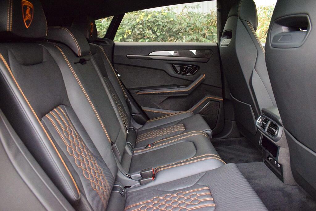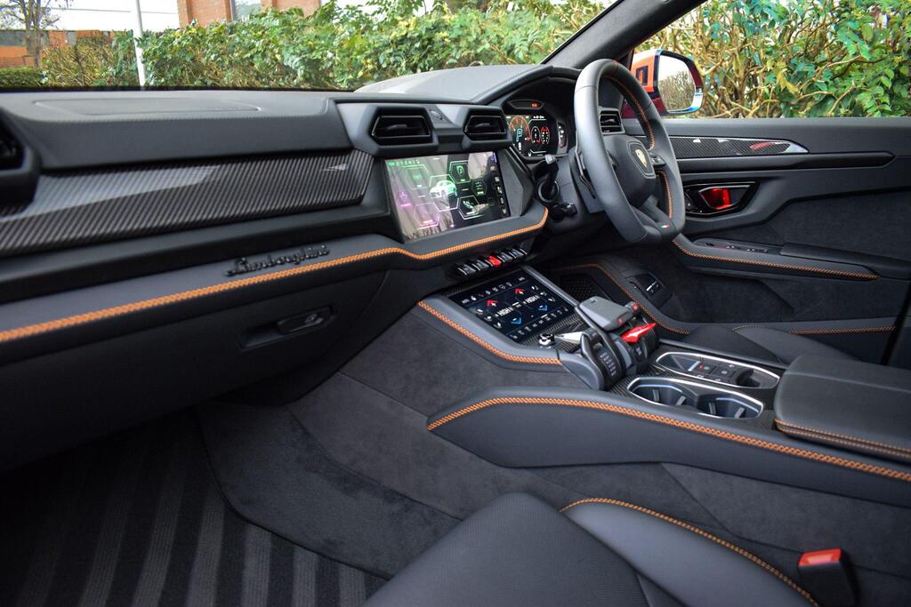 Lamborghini Urus 4.0 V8 BiTurbo 25.9kWh SE Panoramic Sunroof на 23-дюймовых легкосплавных дисках Ad Personam - глянцевые черные диски Taigete с алмазной отделкой, аудиосистема Bang and Olufsen Advanced 3D, матовые черные выхлопные патрубки, черные тормозные суппорты, пакет помощи при парковке с дистанционным управлением, пакет подсветки салона, аудиосистема Bang and Olufsen Advanced 3D. Электрические, вентилируемые и массажные передние сиденья, темный пакет отделки салона, кожаный руль с подогревом и X-образной строчкой, внутренняя отделка крестиком цвета Arancio Leonis, подогрев задних сидений, черные анодированные алюминиевые декоративные вставки, глянцевый черный логотип Lamborghini сзади, Lamborghini ANIMA, встроенные форсунки омывателя.