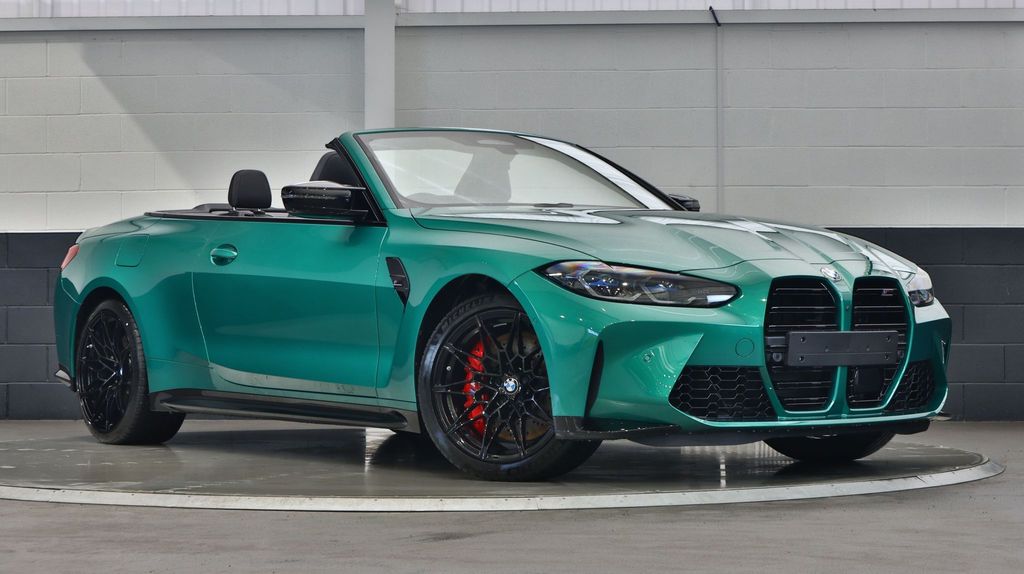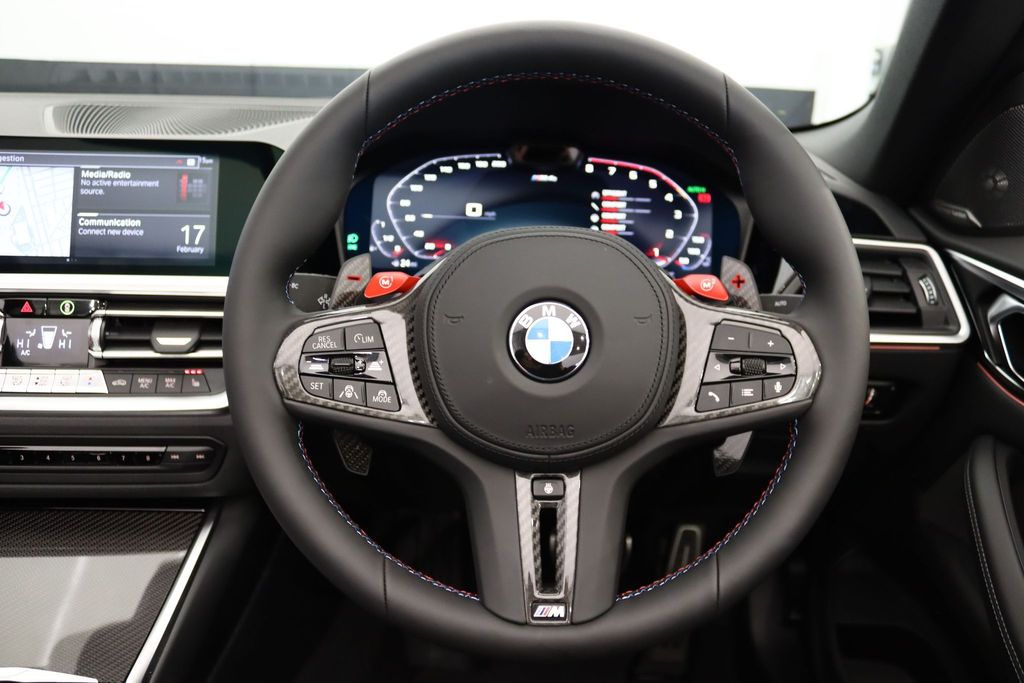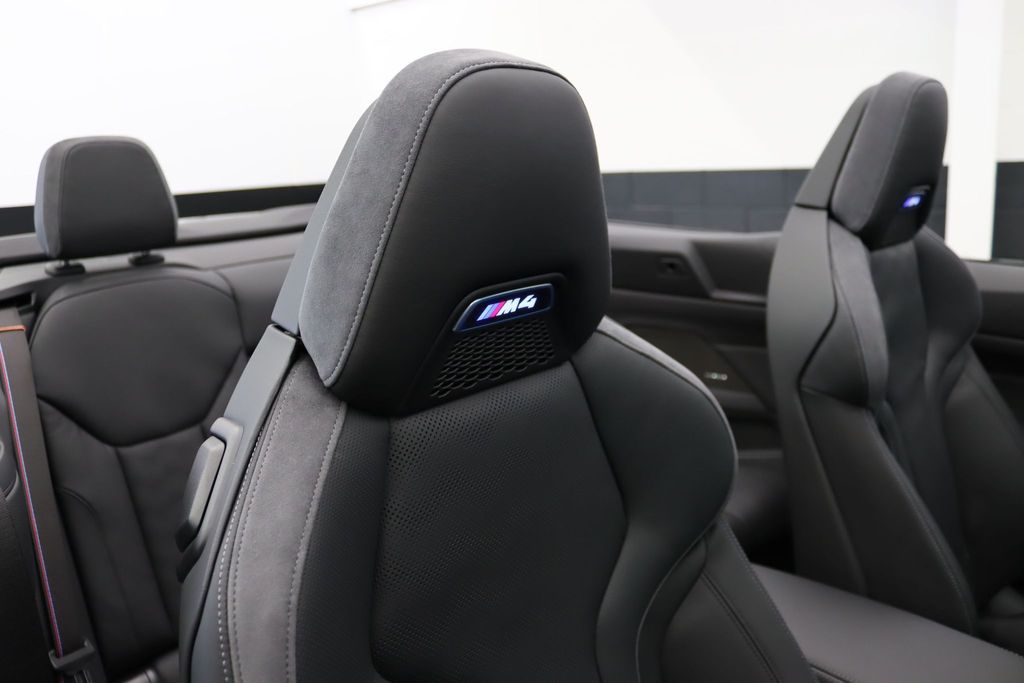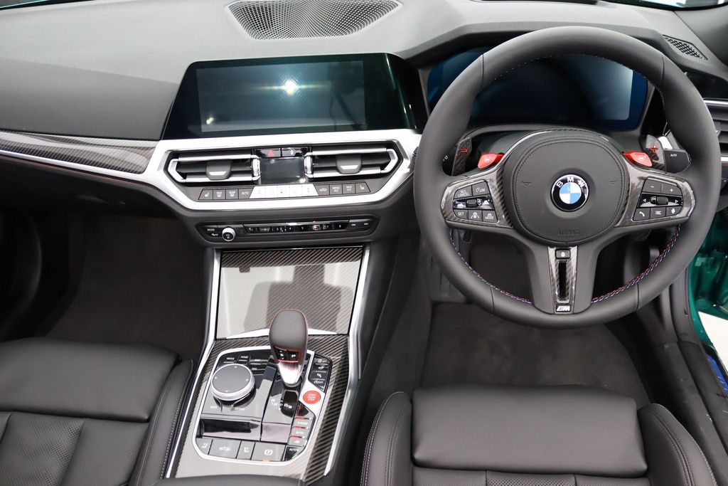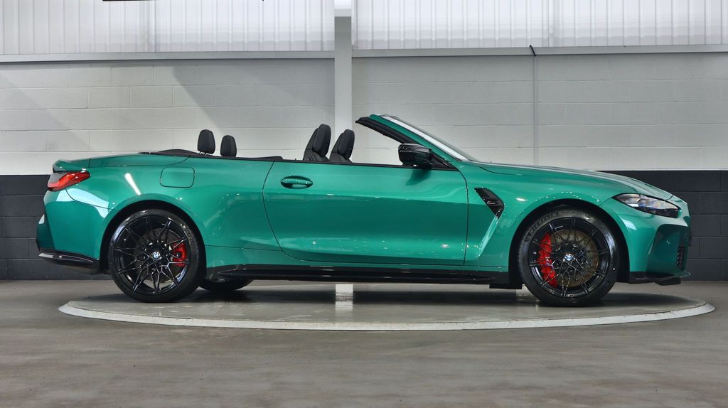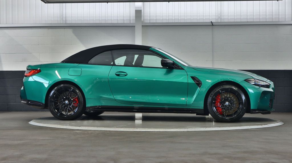 BMW M4 Competition Convertible 3.0 на 19-дюймовых передних и 20-дюймовых задних дисках, двуспицевых, стиль 826 - Forged, цвета Jet Black с разноразмерными шинами. Звуковая система объемного звучания Harman Kardon. Профессиональный помощник вождения. Парковочный ассистент плюс. Круиз-контроль с функцией ограничения скорости. Обогрев руля. Подогрев, поясничная поддержка передних сидений.