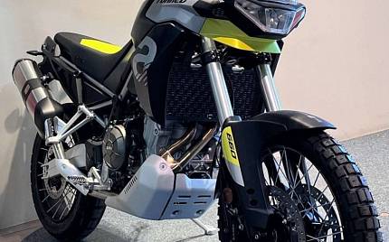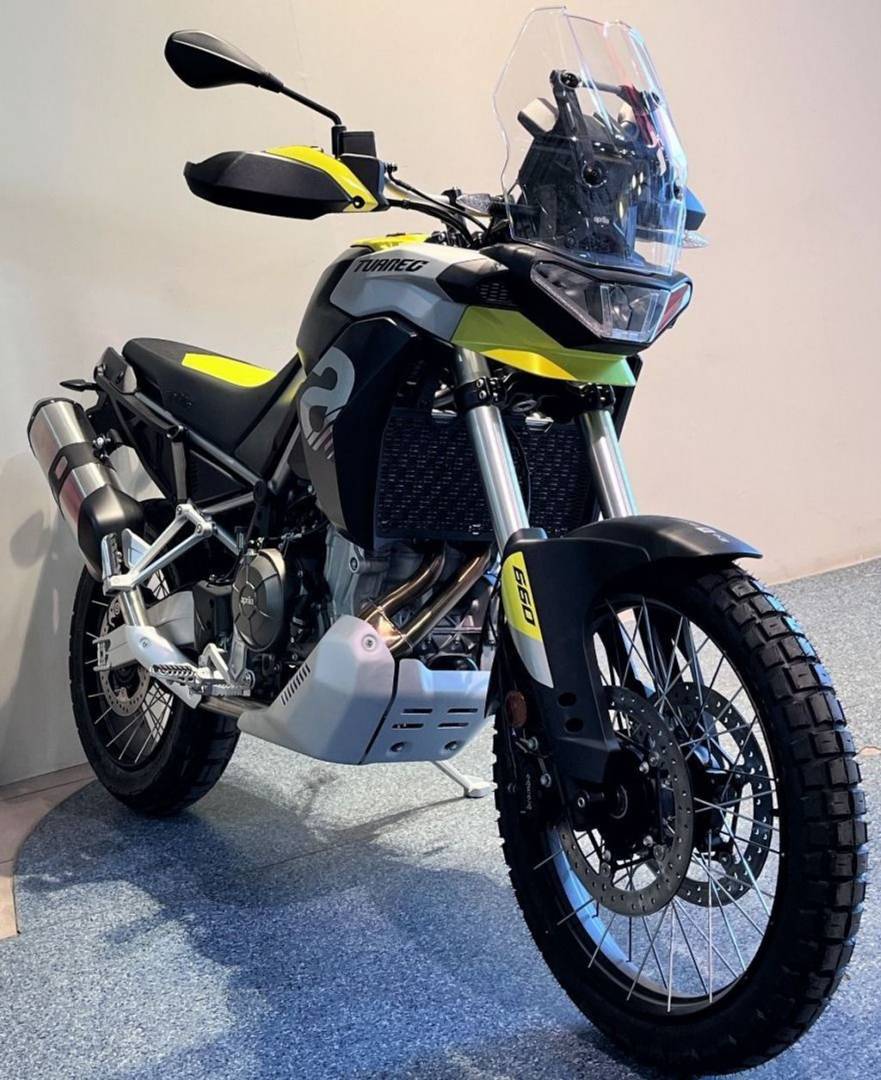Aprilia Tuareg 660. 43-миллиметровая вилка и прогрессивный моноамортизатор с ходом 240 мм обеспечивают сцепление на бездорожье и удовольствие в тех местах, где другим приходится закрывать дроссельную заслонку. Параллельный двухцилиндровый двигатель теперь обеспечивает максимальную мощность 80 л.с., максимальный крутящий момент 70 Нм и значительно улучшенную кривую низких/средних оборотов. Поддон уменьшает вертикальную площадь основания для дорожного просвета более 240 мм и высоты сиденья менее 860 мм.