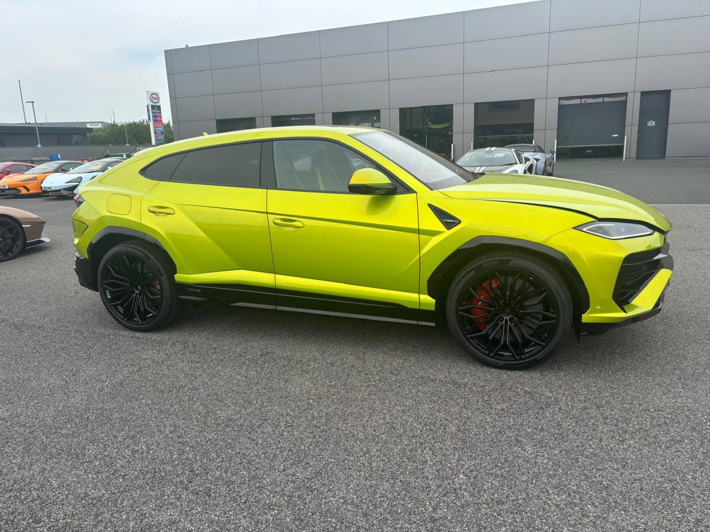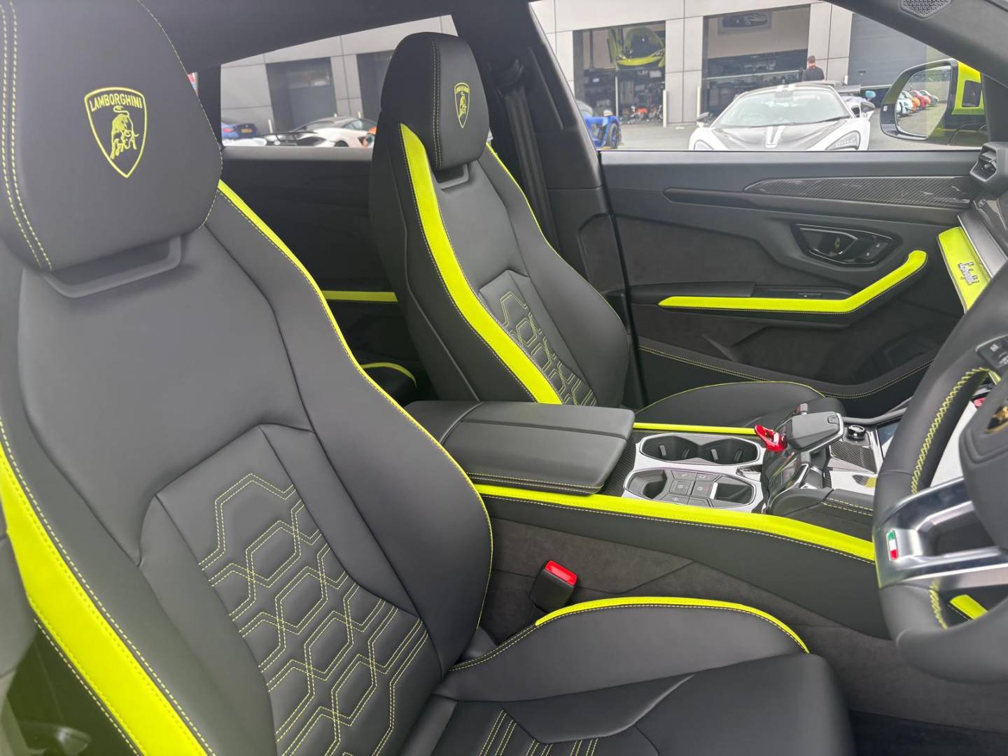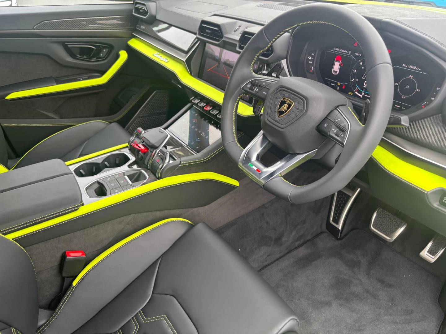 Lamborghini Urus 4.0 V8 BiTurbo 25.9kWh SE Auto 4WD Panoramic Sunroof 23" Galanthus shiny black alloy wheels , Green brake calipers, Ad personal Sportive leather interior with special trim , Optional Stitching on Steering Wheel , Contrast Stitching option , Small Interior shiny carbon fiber pack - Urus, Bang and Olufsen sound system , Dark Package ,Parking assistance with remote park assist pack, Black anodized treatment with Laser Engraving , Heated sports steering wheel in full leather with dark chrome bezel and red marker , Embroidered lamborghini shield on headrest , Ambient light pack - Urus , Ad personam rear spoiler in shiny black , Matt black exhaust tailpipes , Connect vehicle tracking system , Acoustic privacy glass and heat insulated glass , Ad personam door handles in shiny black , Heated rear seats , Heated and heat reflective windscreen ,
