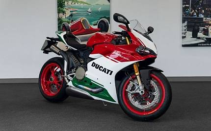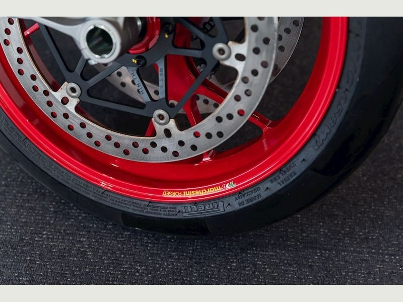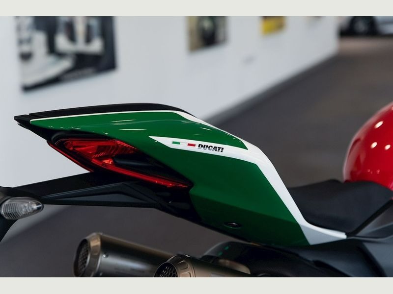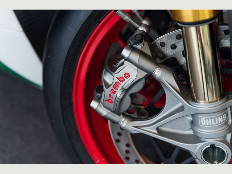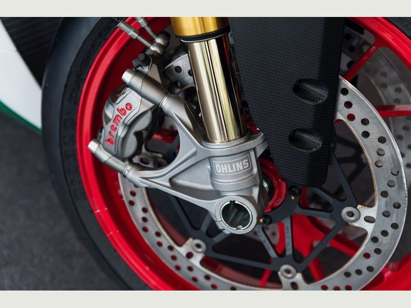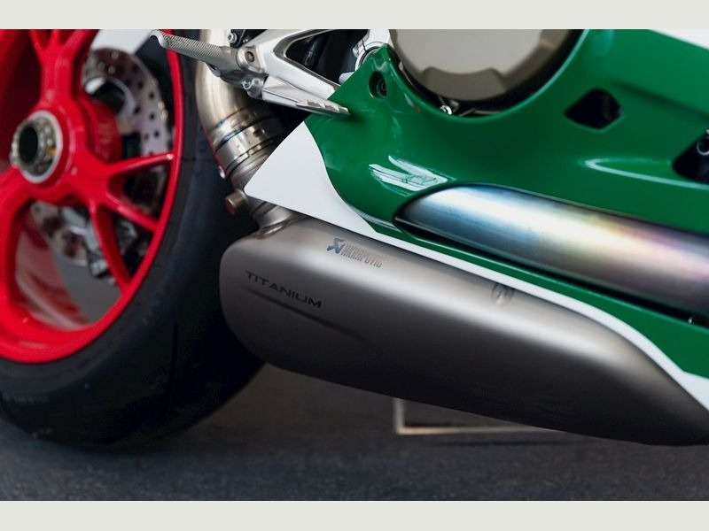 Ducati Panigale R Final Edition | Finished in a Red / Green / White Livery with Red Rims | Riding Modes | Power Modes | Ducati Quickshift Up/Down | Ducati Data Analyzer with GPS and Lean Angle Acquisition | Auto Tyre Calibration | Rapid setting DTC, DWC, EBC | Titanium Connecting Rods and valves | Balanced Crankshaft | Lithium-ion Battery | Auxiliary Adjustment Buttons | Forged Marchesini Aluminium Wheels Painted Red | Akrapovic Homologated Full Titanium Exhaust System | Matt Carbon Fibre Features | Cornering ABS Bosch | Ducati Traction Control EVO | Ducati Wheelie Control EVO | Engine Brake Control | Racing Windshield | Machined Mirror Block-Off Plates | License Plate Mount., The 1299 Ducati Panigale R FE was created to celebrate Ducati’s most Powerful Twin Cylinder ever!