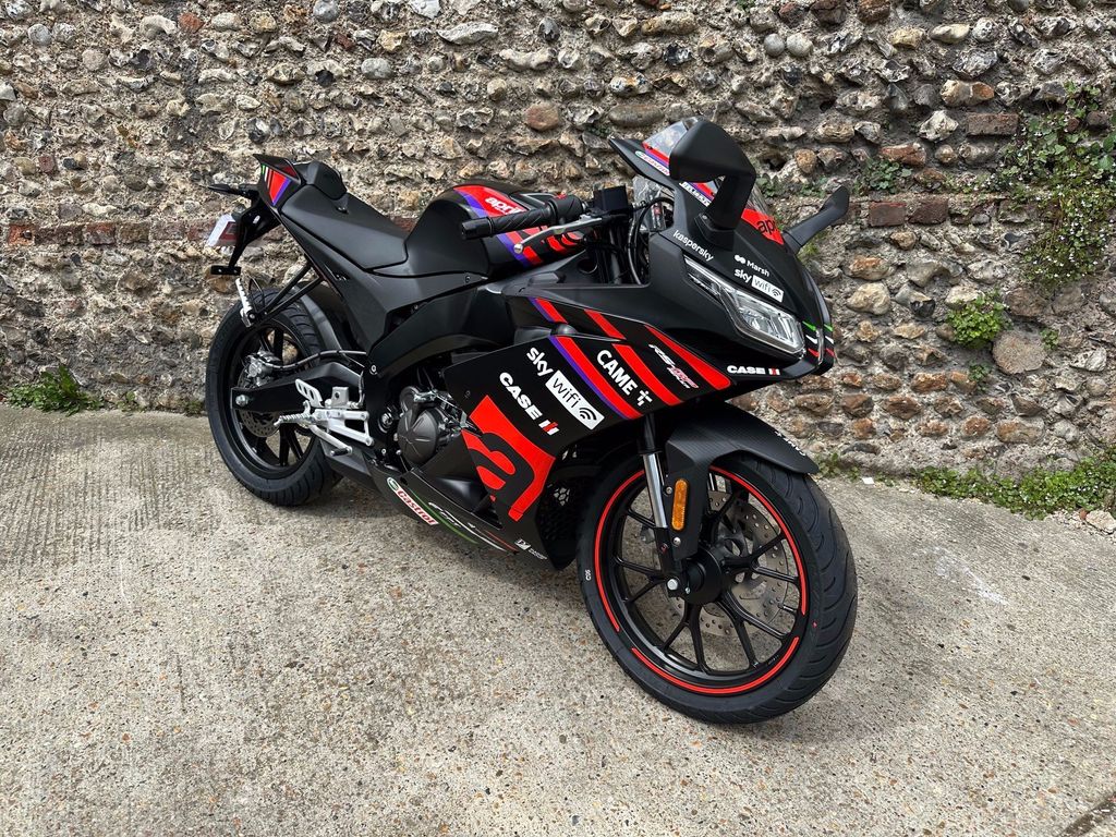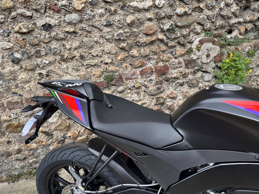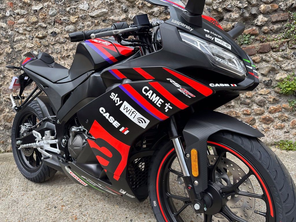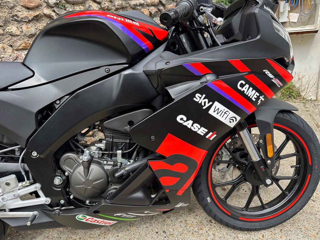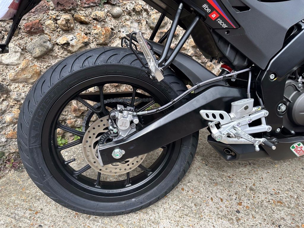 Aprilia RS 125 Replica GP. The technological heart of the Aprilia RS 125 is a 4-valve distribution, liquid-cooled single cylinder with completely revamped thermodynamics. It delivers a more robust torque curve, with maximum power reached at lower revs, meaning reduced fuel consumption. The new engine is Euro 5-compliant, for outstanding performance that doesn’t come at the cost of the environment. The Aprilia RS 125 promises a riding position that is truly sporty, with no compromises, no shortcuts taken. The foot pegs are designed to avoid fatigue, the handlebar is placed so that the rider has total control of the bike, with the clip-ons raised by 18 mm for greater comfort. The Aprilia RS 125 also sports a new digital instrument display, packed with data such as fuel level indicator, instantaneous and average fuel consumption, remaining mileage and much more.