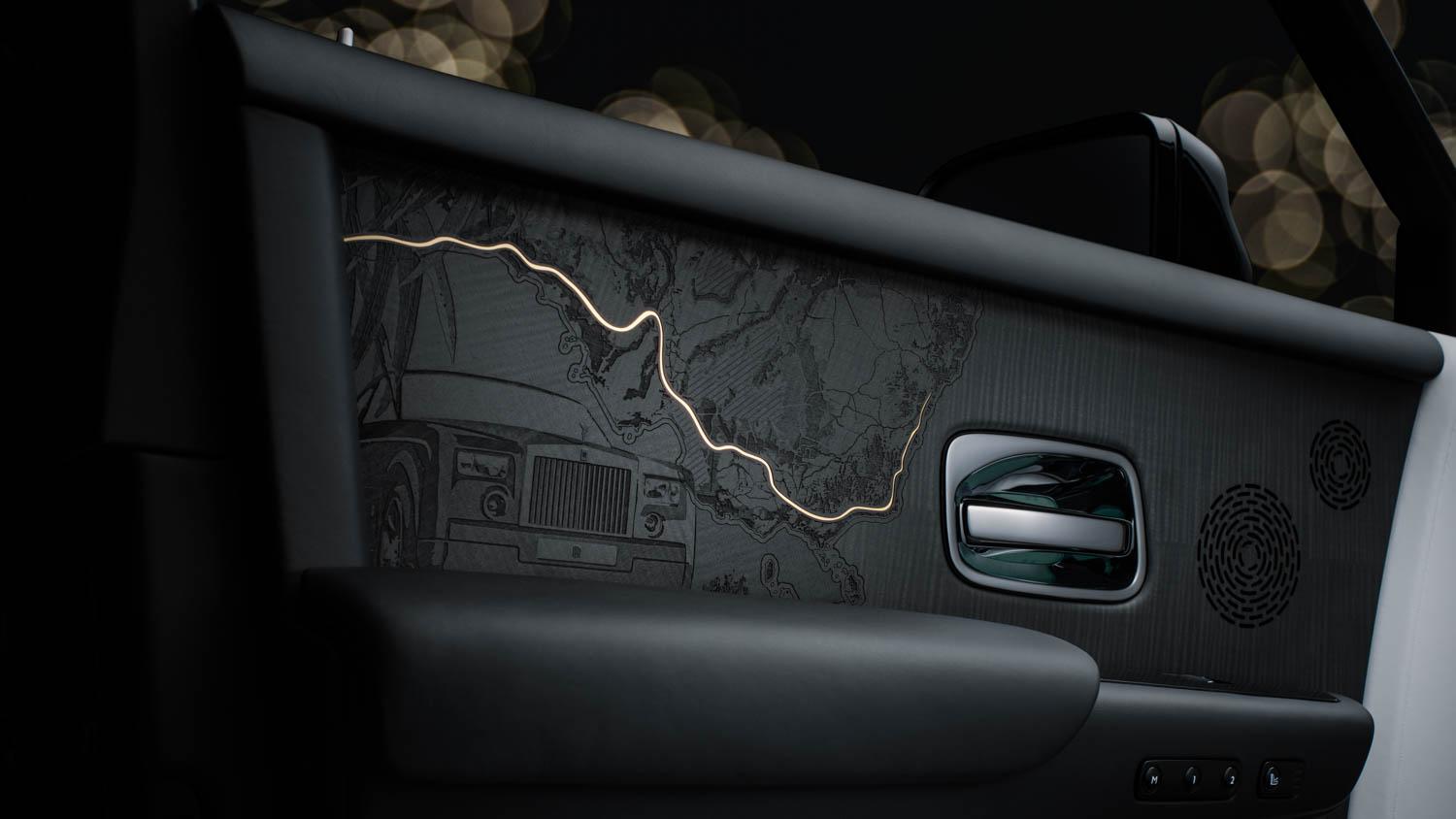 Дверные панели выполнены из редкого Blackwood и содержат самые сложные деревянные инкрустации, когда-либо сделанные для Rolls-Royce. На них изображены сцены из столетней истории Phantom. Задние двери украшает береговая линия Ле-Райоль-Канадель-сюр-Мер, где сэр Генри Ройс проводил зимы. Правая передняя дверь показывает ландшафт Уэст-Уиттеринга, его летней резиденции.